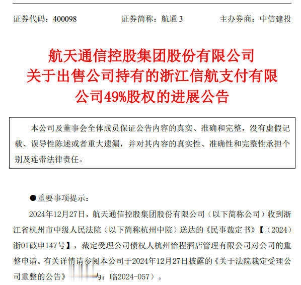 日前,航天通信控股集团股份有限公司发布“关于出售公司持有的浙江信航支付有限公司49%股权的进展公告”。