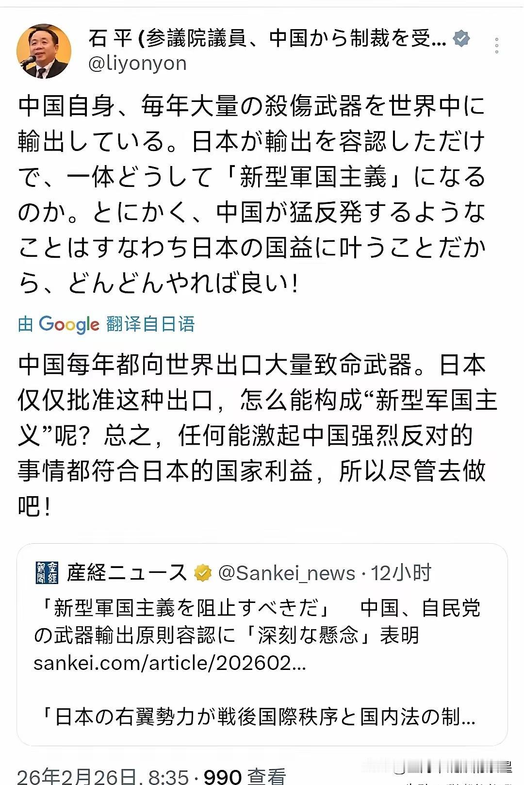 汉奸石平又发文,没想到竟然说了这样一段话! 汉奸石平2月26日写道:“中国每年都向世界出口大量致命武器。日本仅仅批准这种出口,怎么能构成‘新型军国主义’呢?/内容 这逻辑听着好像挺唬人,其实压根儿经不起推敲。一个四川长大的北大毕业生,现在是铁了心要把日本扩军那点脏水,往自己老家身上泼。 斯德哥尔摩那边的数据明摆着,中国近五年武器出口才占全球5.9% 。卖出去的东西,合同里写得清清楚楚,不干涉人家内政。可日本呢?就在石平发文前一天,2月25号,自民党刚开完会,要废掉那个“防御装备转移三原则” 。 什么叫“仅仅批准”?战斗机、导弹、护卫舰,以后都能随便卖给正在打仗的国家了。这不是松绑是什么? 前两天日本防卫相还亲口说的,要在距离台湾只有110公里的与那国岛,2030年前部署导弹部队 。那可是咱家门口,刀尖都快捅到肋骨上了,石平先生是真看不见还是装瞎? 他在日本也待了几十年了,东京街头那些举着牌子喊“不要战争”的老百姓,都比他清醒。人家日本人自己都怕军国主义那套玩意儿再从笼子里跑出来 。 说白了,这位改名叫“太郎”的先生,不是在讲道理,是在交投名状。去年刚选上日本参议员,转头就跑去靖国神社“报道” 。现在主子要扩军了,他不得跳出来帮忙洗地? 就为了主子碗里那口残羹剩饭,脸都可以不要。 可悲的是,他以为这样能在日本站稳脚跟。日本网友有一句话问得特扎心:“一个连祖国都能出卖的人,真的值得信任吗?” 这世上有些门,出去了就再也回不来。去年9月外交部对他动了真格,冻结资产、终身禁止入境 。什么意思?就是四川老家那点儿念想,宽窄巷子的烟火气,这辈子只能在梦里咂摸滋味了。 听说他最近老念叨想回四川 。六十四了,人一老就容易想根。可那句话怎么说来着?早知今日,何必当初。当年为了混进日本右翼圈子,连南京大屠杀都敢否认,连汶川地震都喊着别给中国援助 。 把背叛当生意做的人,最后总会发现,自己成了最不值钱的筹码。 各位读者你们怎么看?欢迎在评论区讨论。