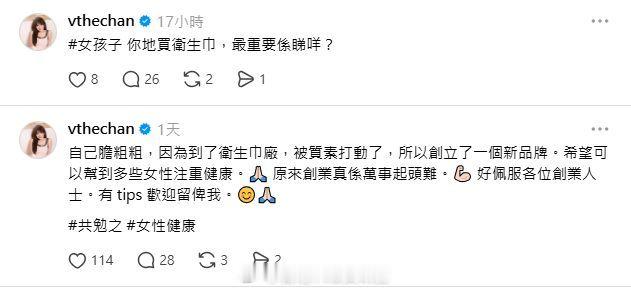 陈思圻分享个人经历在与网友的互动中,陈思圻分享个人经历:「以前我都是买最便宜牌子,然后做了很多卫生巾测试,发现原来很多恐怖的棉花,真的会感染。」有网友提供市场策略建议,例如「控制成本最重要」、「先做好各方面调研」,甚至有人提出合作意向,陈思圻用心逐一回复。