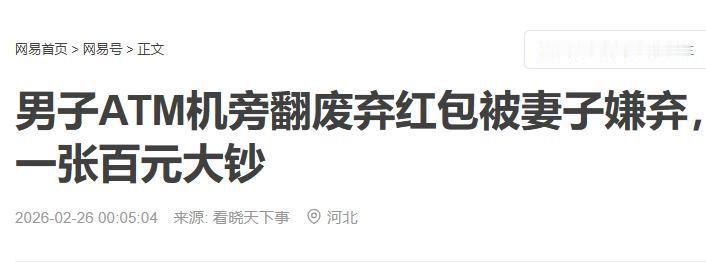 浙江,男子和妻子一起到银行的ATM机取钱,准备离开时,男子突然对地上堆放的废弃红包起了兴趣,直接弯下腰一张张的查看,妻子在旁边看的不耐烦,结果男子还真从红包里翻到了钱。网友:可恶,真让他给捡到了。 不少人路过银行 ATM 机区域时,都会对地上的废纸、空红包视而不见,可浙江一对夫妻取钱时,却因为一堆被人丢弃的红包,上演了一场让人哭笑不得的小插曲。 当天,男子和妻子一起到银行的 ATM 机取钱,办完业务转身准备离开,男子的目光突然被角落一堆废弃红包吸引住。这些红包大多皱巴巴的,有的被揉成一团,有的封口敞开,明显是别人用完随手扔在地上的,看起来就是一堆没用的废纸。妻子压根没把这些红包放在眼里,拉着男子就想走,可男子却停下脚步,对这些被丢弃的红包来了兴趣。 他不顾妻子的催促,直接弯下腰,蹲在地上一张张仔细翻看。妻子站在一旁,看着丈夫蹲在地上翻捡垃圾的样子,脸上满是不耐烦,时不时催促两句,觉得丈夫这是在浪费时间,谁会把钱留在空红包里扔掉。男子却像没听见一样,依旧耐心地把散落的红包逐一打开检查,不放过任何一个看起来有内容的红包。 就在妻子快要忍不住抱怨时,男子的动作突然停了下来,他从一个折得有些变形的红包里,轻轻抽出了一张平整的百元钞票。看到真的翻出了钱,妻子瞬间愣住,之前的不耐烦一扫而空,语气也变得惊讶又好笑。男子拿着这张意外收获的现金,脸上露出惊喜的神情,谁也没想到,一堆被人嫌弃的废弃红包里,真的藏着被遗漏的钱。 这件事被传到网上后,很快引发网友热议。有人调侃说,可恶,真让他给捡到了;也有人表示,自己路过类似地方从来不会多看一眼,这下算是长了见识。还有网友分享自己的经历,有人在废弃红包里翻过硬币,有人在商场的红包堆里找到过小面额现金,看似不起眼的小细节,往往藏着意想不到的小惊喜。 其实春节过后,不少地方都会出现被丢弃的红包,很多人拆完红包,把钱拿走就随手把空红包扔在路边、银行、超市等公共场所,很少有人会留意,自己是不是不小心把钱留在了红包里。有的红包折叠后,夹在里面的现金不容易被发现,随手一扔,就成了别人眼中的意外收获。 这件小事也给大家提了个醒,处理红包时一定要多检查一遍,尤其是折叠过的红包、双层设计的红包,很容易把零钱、纸币夹在里面。不管是百元大钞还是小额现金,都是自己的辛苦钱,因为粗心大意弄丢,实在有些可惜。而对于捡到钱的人来说,意外收获固然开心,也别忘了,如果捡到数额较大的现金或者贵重物品,及时寻找失主或者交给相关部门,才是最稳妥的做法。 生活里总有这些不起眼的小插曲,有人觉得翻废弃红包是多此一举,有人却能从中收获小惊喜。看似是运气,其实也藏着细心,与其羡慕别人的意外收获,不如自己多一份细心,减少不必要的损失。 你路过废弃红包时会多看一眼吗?有没有过类似的意外小收获?