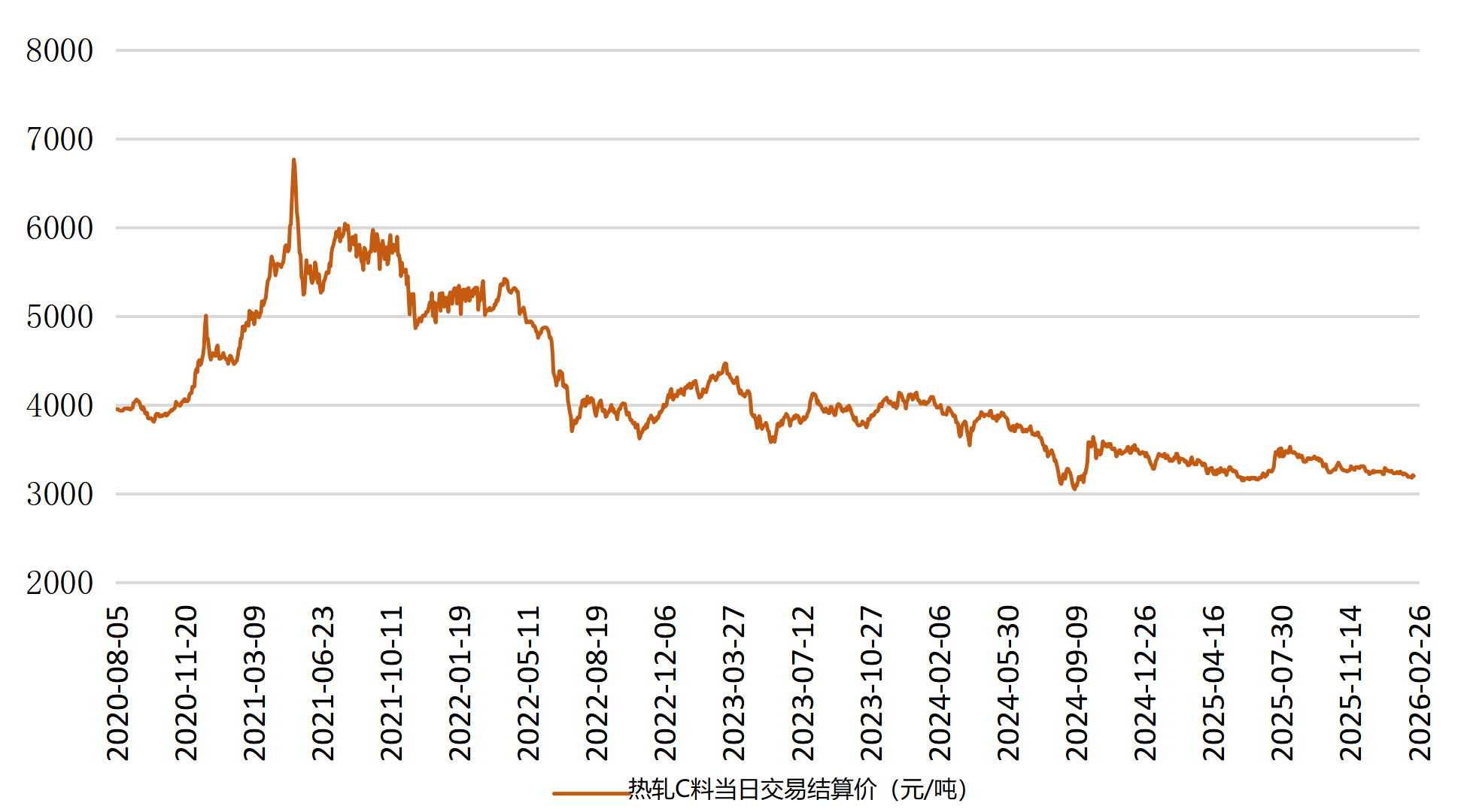 截至2月26日,新华·山东港口热轧C料价格报3200元/吨,较前一交易日下跌10元/吨,跌幅0.31%。