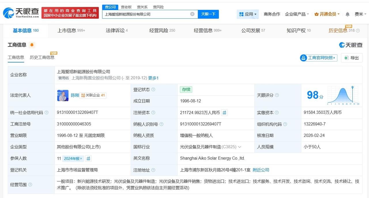 爱旭股份增资至21.2亿 增幅约16% 天眼查App显示,近日,爱旭股份(600732)发生工商变更,注册资本由约18.3亿人民币增至约21.2亿人民币,增幅约16%。 该公司成立于1996年8月,法定代表人为陈刚,经营范围包括新兴能源技术研发、光伏设备及元器件制造、光伏设备及元器件销售等,由陈刚、珠海横琴舜和企业管理合伙企业(有限合伙)、和谐天明投资管理(北京)有限公司-义乌奇光股权投资合伙企业(有限合伙)等共同持股。 天眼查信息: