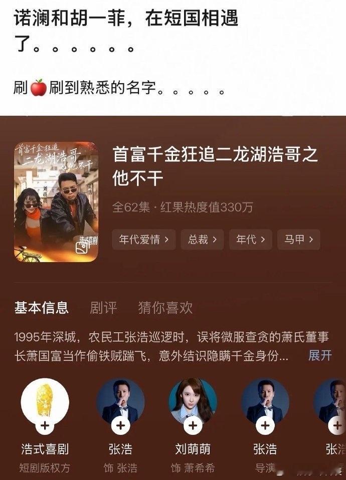胡一菲诺澜在短国相遇了胡一菲诺澜在短剧相遇了 有网友发现,曾在《爱情公寓》中饰演诺澜的刘萌萌也开始演短剧了,此前娄艺潇也进军了短剧赛道,胡一菲诺澜就这样在短国“重逢”了