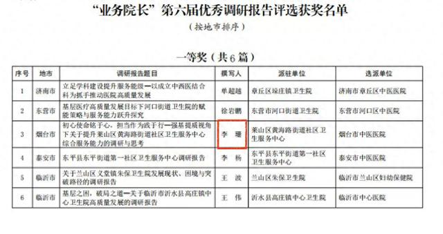 胶东在线2月26日讯(通讯员杜晓菲)近日,山东省卫生健康委员会举办的全省第六届“业务院长”优秀调研报告评选结果揭晓,莱山区黄海路街道社区卫生服务中心挂职业务院长李珊撰写的调研报告《初心使命铭于心,担当作为践于行——强基提质视角下关于提升莱山区黄海路街道社区卫生服务中心综合服务能力的调研与思考》,凭借扎实的调研、精准的分析和可行的举措,荣获省级一等奖。