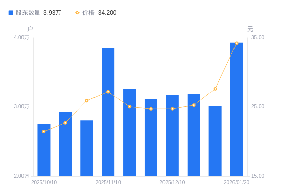 日期A股户数(户)流通A股户均持股数(股)户均持股市值(万元)2026-01-313975922540.9767.132026-01-203929022810.0478.012026-01-093011029764.4182.212025-12-313062829261.0173.272025-12-193183928148.0771.072025-12-103173528240.3169.732025-11-283116528756.8270.972025-11-203259427496.0568.802025-11-103845423305.9363.392025-10-312807531921.8682.68