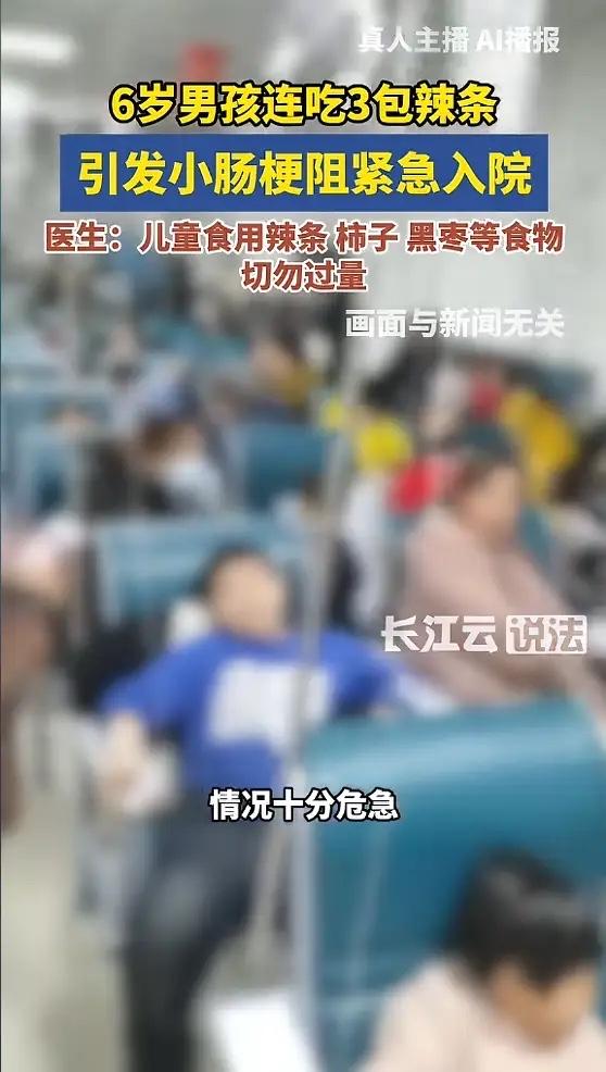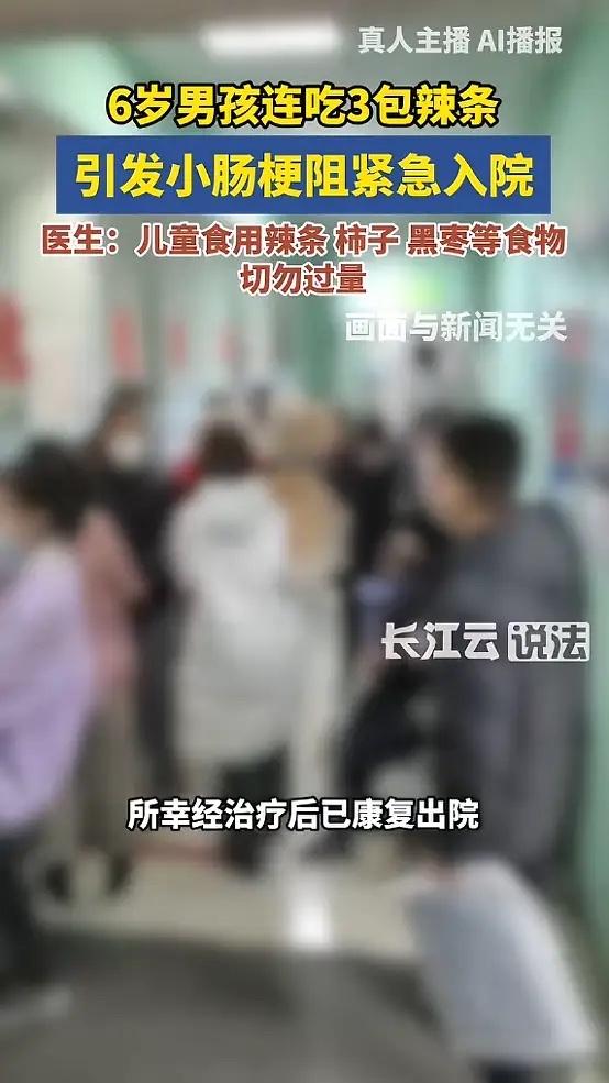 “悲剧还是发生了!”2月16日,湖北荆州,一男孩平时就喜欢吃辣条,爷爷奶奶平时不怎么管,除夕当天,男孩一次性吃下三包辣条后,很快突发急性腹痛,紧急送医后,发现男孩因为胃结石和肠结石引发了小肠梗阻!网友:还敢乱吃吗? 这个男孩今年才6岁,平时跟着爷爷奶奶在村里生活。老人家年纪大了,对孩子吃零食这事管得没那么严。孩子就爱吃那种五毛、一块钱一包的辣条,味道重,吃起来过瘾。爷爷奶奶觉得,孩子爱吃就吃点吧,也不是什么大事。 除夕那天,家里忙着准备年夜饭,大人没顾上他。孩子自己翻出三包辣条,撕开包装,一根接一根,吃得满嘴油光。没过多久,他就捂着肚子喊疼,小脸煞白,疼得在地上打滚。爷爷奶奶吓坏了,赶紧叫了救护车,把孩子送到了荆州市第一人民医院。 送到医院时,孩子已经疼得说不出话了。医生检查CT结果显示孩子的胃里和小肠里,竟然形成了结石,把肠子给堵住了。这就是医学上说的“胃结石”和“肠结石”引发的小肠梗阻。食物下不去,肠子胀得厉害,再拖下去,肠子可能坏死,那就危险了。 医院马上组织了多学科会诊,小儿外科、内科、消化科、麻醉科的医生都来了。最后决定用一种叫“双镜联合”的微创手术来治。一边用腹腔镜从肚子外面看,一边用消化道内镜从嘴里伸进去,双管齐下,把那些结石弄碎、取出来。手术很成功,孩子总算脱离了危险,后来慢慢康复,出院回家了。 辣条这类零食,高油、高盐、添加剂多,不容易消化,对孩子娇嫩的肠胃来说,更是种负担。短时间内大量吃下去,在胃里和肠道里容易结成一团,就像石头一样,把通道堵死。除了辣条,像柿子、黑枣这类鞣酸含量高的食物,孩子吃多了也可能出现类似问题。 因为乱吃零食吃出毛病的孩子,每年都有,辣条里的辣椒素、各种香精色素,会直接刺激肠胃黏膜。盐分高得吓人,一包辣条的含盐量,可能就够孩子一天的量了。长期吃,不光伤胃,还可能让孩子挑食、营养不良,甚至影响长个子。 孩子不懂事,但大人不能不懂。尤其是过年过节,零食随手可得,监管更不能放松。不是说一口都不能吃,而是要控制量,解个馋就行。更重要的是,平时多给孩子准备点健康零食,比如新鲜水果、酸奶、坚果。 我们总说“病从口入”,但很多时候,危险就藏在那些花花绿绿的包装袋里。爱孩子,不是满足他所有的口腹之欲,而是帮他建立起一道健康的饮食防线。这道防线,需要每个家长的细心和坚持。 各位读者你们怎么看?欢迎在评论区讨论。