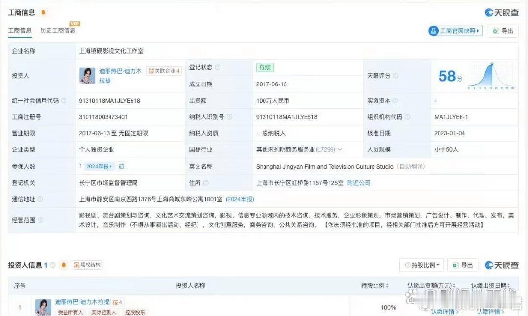 迪丽热巴已成立个人独资工作室天眼查任职信息显示,迪丽热巴·迪力木拉提名下关联多家企业,其中上海镜砚影视文化工作室为其个人独资企业。该工作室成立于2017年6月,出资额100万人民币,经营范围包括影视剧、舞台剧策划与咨询等。