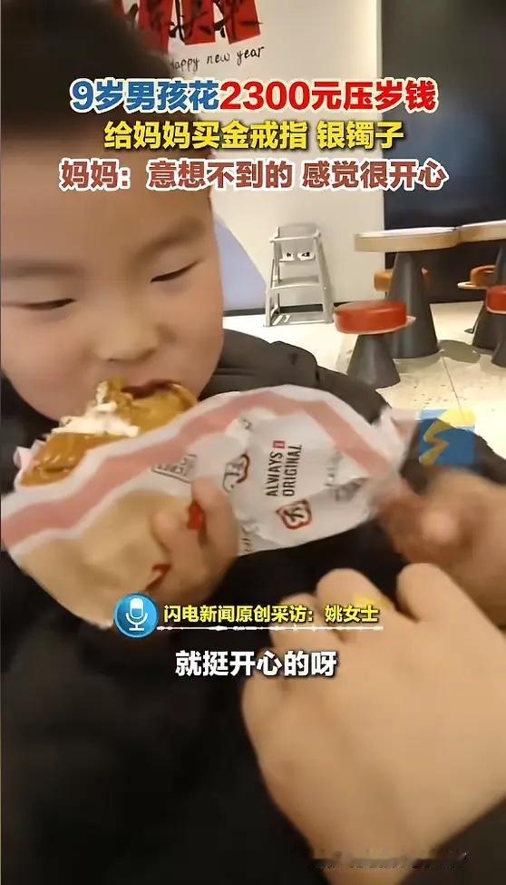 “这儿子没白养!”近日,浙江嘉兴,一男孩偷偷出门,用3000元压岁钱给妈妈买金戒指和银手镯,还特意带了一杯妈妈爱喝的奶茶,当他送给妈妈时,一句“给妈妈花钱我一点也不心疼”,让妈妈瞬间感动!网友:从小就是暖男! 姚女士9岁的儿子,过年收到了一笔压岁钱,大概三千块。钱在孩子口袋里还没捂热,他就悄悄计划了一个大惊喜。那天下午,妈妈发现孩子不见了,压岁钱也没了影。心里正嘀咕这孩子跑哪儿去了,是不是买玩具去了。 没想到,儿子是自己骑上自行车,一路找到了镇上的金店。他记得妈妈平时聊天时说过喜欢什么样的款式,就指着其中一枚简单的足金戒指和一只秀气的银手镯,对店员说:“我要买这个,送给我妈妈。” 孩子从口袋里掏出叠得整整齐的的钞票,一张一张数清楚,付了钱。买完首饰,他没忘记拐去奶茶店,用剩下的零钱买了妈妈最爱喝的那杯奶茶。然后揣着宝贝,一路小跑着回家。 当姚女士看到儿子气喘吁吁地递过来一个精致的首饰袋和一杯奶茶时,整个人都愣住了。打开袋子,她的眼泪瞬间就涌了上来。孩子特别认真地说:“妈妈带我很辛苦,我的钱只有你花,我一点都不心疼。” 这句话,比任何金银都珍贵。姚女士说这不是儿子第一次用压岁钱给她买礼物了。去年他也买过,只是今年胆子更大,自己一个人就完成了“采购任务”。孩子平时对自己挺“抠门”,零食玩具都不太舍得买,可给妈妈花钱,眼睛都不眨一下。 这个故事传到网上,暖哭了无数人。大家羡慕的不是那枚戒指或手镯,而是孩子那份毫无保留的爱。我们总以为孩子还小,什么都不懂。其实他们心里跟明镜似的,谁对他好,他都记得。妈妈日复一日的辛苦,他看在眼里,疼在心里。那笔压岁钱是他能想到的、回报妈妈最好的方式。 这份礼物,尺寸也许不大,价格也许不菲,但里面装着的,是一个孩子最干净、最纯粹的世界。他的世界很小,小到只装得下妈妈;他的爱又很大,大到愿意倾其所有。 压岁钱的意义不再仅仅是长辈的祝福,更成了孩子学习爱与表达的“第一桶金”。如何引导孩子认识金钱、使用金钱,背后其实是更重要的亲情教育和感恩教育。姚女士的感动,是因为她看到了自己平日付出的爱,在孩子心里开出了花。 你养我小,我疼你老。这份疼,不一定在遥远的未来,它可能就藏在孩子攥得热乎乎的压岁钱里,藏在他为你精心挑选的、那份有点笨拙却无比真诚的惊喜里。 各位读者你们怎么看?欢迎在评论区讨论。