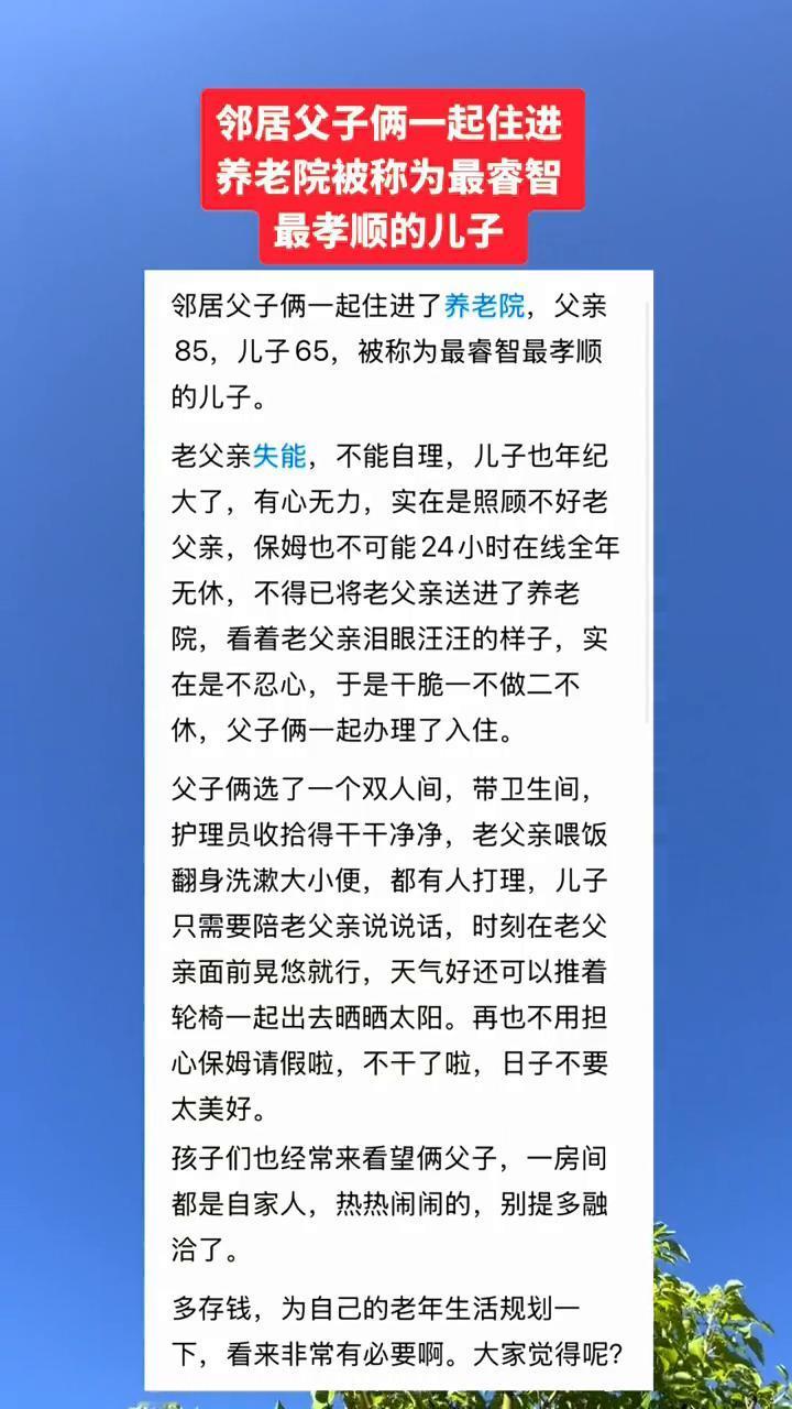 邻居父子俩一起住进养老院被称为最睿智、最孝顺的儿子。 邻居父子俩一起住进了养老院,父亲85,儿子65,被称为最睿智、最孝顺的儿子。老父亲失能,不能自理,儿子也年纪大了,有心无力,实在是照顾不好老父亲,保姆也不可能24小时在线全年无休,不得已将老父亲送进了养老院。看着老父亲泪眼汪汪的样子,实在是不忍心,于是干脆一不做二不休,父子俩一起办理了入住。 父子俩选了一个双人间,带卫生间,护理员收拾得干干净净,老父亲喂饭、翻身洗漱、大小便都有人打理,儿子只需要陪老父亲说说话,时刻在老父亲面前晃悠就行,天气好还可以推着轮椅一起出去晒晒太阳。再也不用担心保姆请假啦,不干了啦,日子不要太美好。 孩子们也经常来看望俩父子,一房间都是自家人,热热闹闹的,别提多融洽了。多存钱,为自己的老年生活规划一下,看来非常有必要。大家觉得呢?