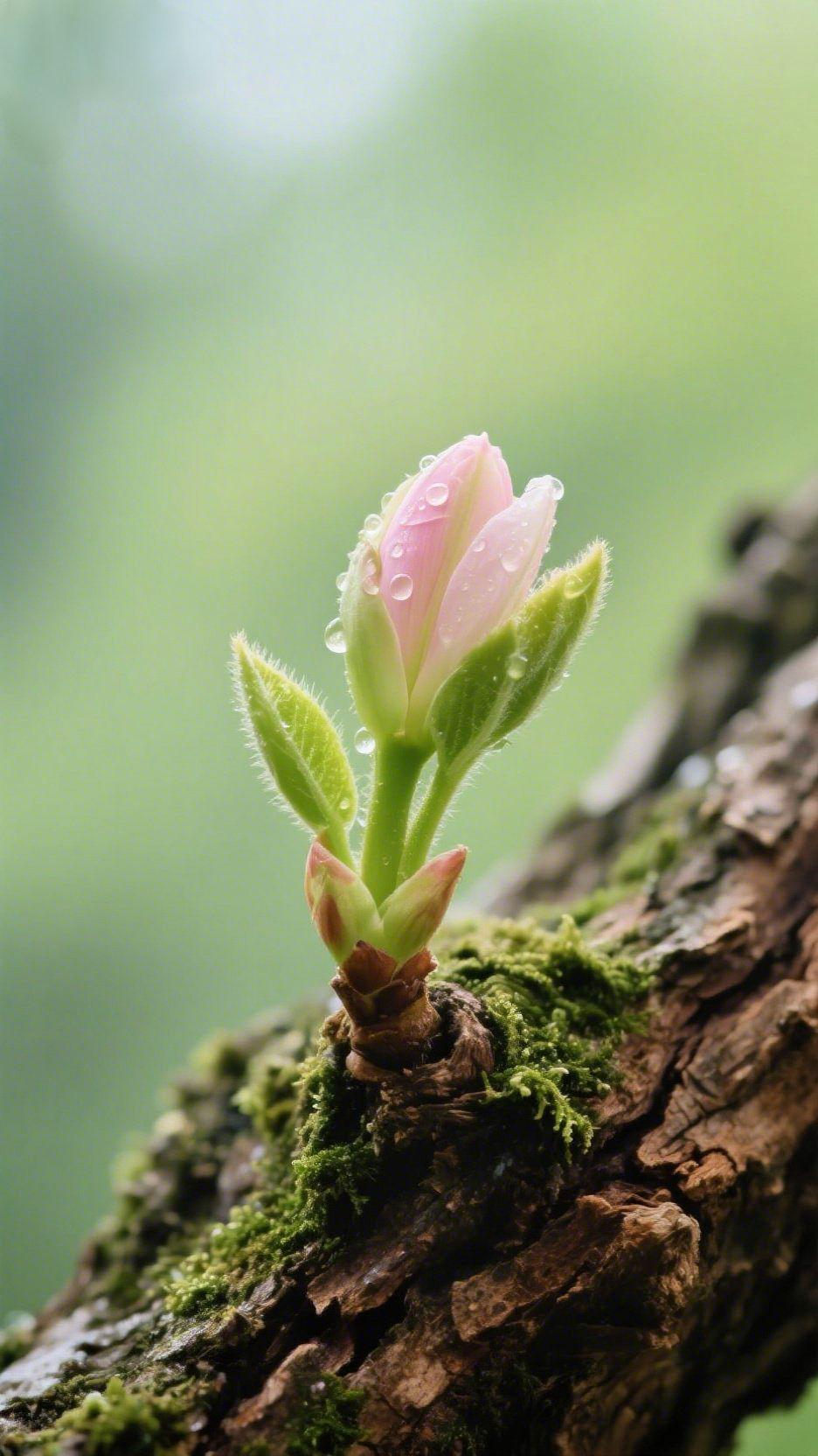枯木上的新生 雨后的清晨,空气里还裹着湿润的草木香,目光落在一截饱经风霜的老枝上——深褐的裂纹里,苔藓悄悄铺了层绒绿,而更让人屏息的,是那点从枯木里钻出来的新芽。 粉白的花苞凝着剔透的水珠,像揉碎的晨露嵌在嫩瓣上,带着细绒毛的新叶怯生生地舒展,把枯寂的枝干,晕染出一整个春天的温柔。 原来生命从不会被过往的斑驳困住,哪怕扎根在沉郁的旧时光里,也能攒着劲儿,把每一滴雨露都酿成破土的勇气。风掠过的时候,新芽轻轻晃,像是在说,再深的枯寂,也藏着新生的伏笔。 自然之美 生命力量
