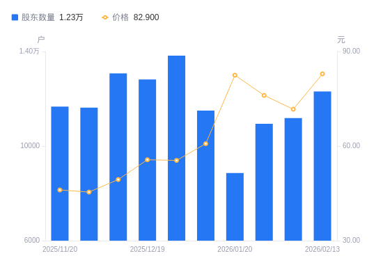 日期A股户数(户)流通A股户均持股数(股)户均持股市值(万元)2026-02-13123088124.8067.352026-02-10111858940.5564.092026-01-30109399141.6069.542026-01-20886211284.1393.082026-01-09115038693.3852.812025-12-31138227234.8440.122025-12-19128147803.9643.442025-12-10130737649.3537.772025-11-28116288599.9339.052025-11-20116698569.7139.49