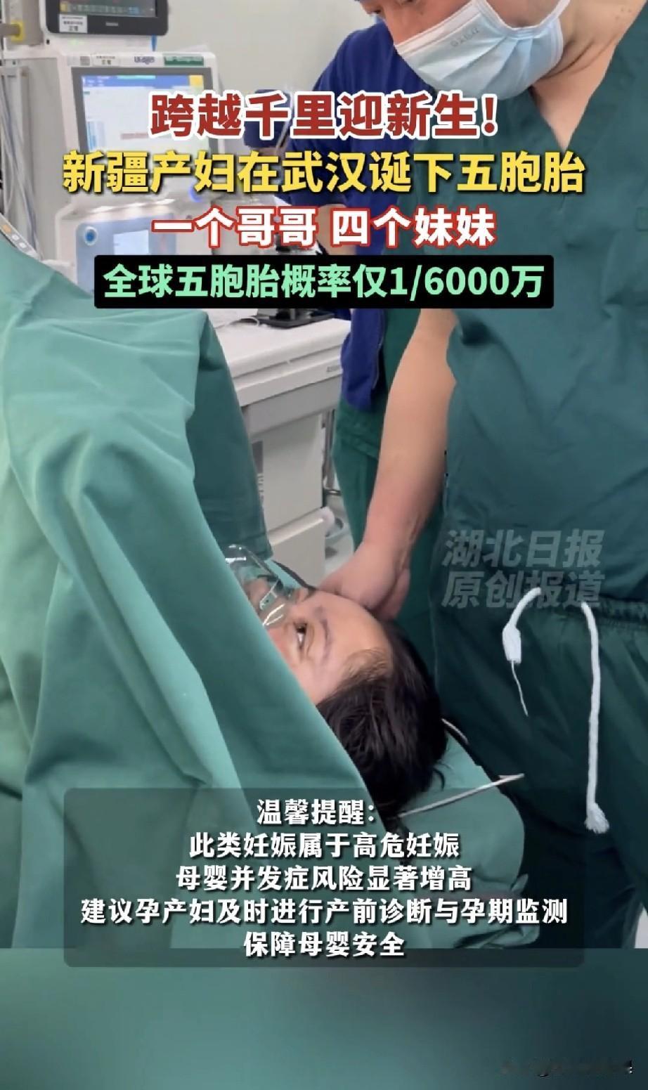 家人们谁懂啊!今天凌晨武汉直接炸出一个年度大瓜——一位24岁的新疆妈妈,在中南医院直接“爆仓”,不是双胞胎,不是三胞胎,是五胞胎啊!1男4女,凑齐了“五小福”天团原地出道! 全球自然受孕五胞胎的概率才六千万分之一,这运气去买彩票不得直接中头奖?这哪是生孩子,分明是把一整个“迷你足球队”揣在肚子里,直接踢到了武汉! 想想这位妈妈,带着五个小生命一路奔波,医院的医护团队更是拼尽全力,多学科专家24小时待命,硬生生把这个“极致挑战”变成了“平安落地”。现在五个宝宝虽然体重偏轻,但评分都在6分以上,生命体征稳定,妈妈也恢复得很好。 现在五个宝宝都在保温箱里“躺平发育”,虽然体重偏轻,但个个精神抖擞。这位妈妈也太牛了,直接从“新手玩家”升级成“终极BOSS”,以后家里的热闹程度,怕是连广场舞大妈都要甘拜下风! 祝福这五个小天使,也心疼这位妈妈——以后家里开饭,怕是要直接摆个流水席了!😂