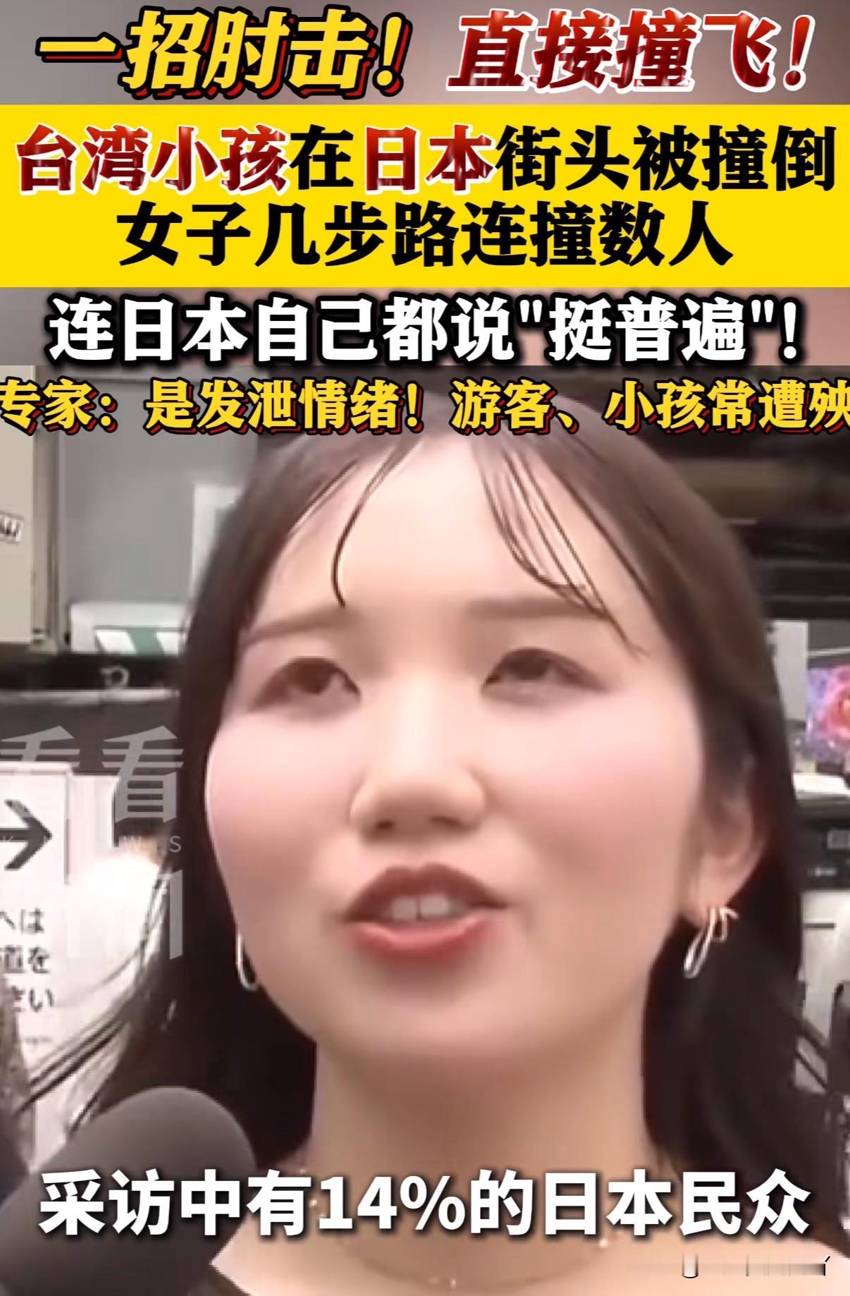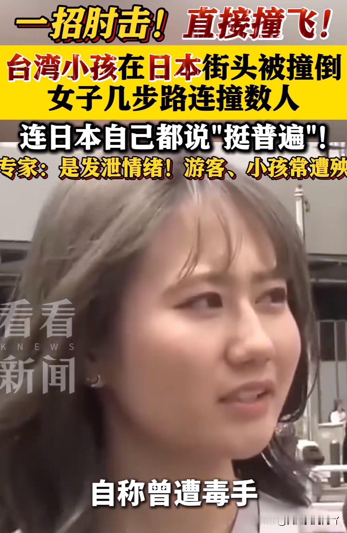 台湾一位妈妈带着读小学的女儿到日本东京游玩孩子在涩谷街头被一名日本女人故意撞飞,日本人说这很普遍只是在发泄情绪 2月25号这位台湾妈妈将视频发布网络后引起两边网友争论,细看视频这名撞人的日本女人在撞飞小女孩之前还故意撞击了另一名路过男子 对此不少曾经去日本旅游的人表示也有过相同经历,据日本媒体报道“撞人族”正在逐步增加,并有14%的日本人表示也遭遇过同样的恶意撞击,猜测是因日本人将生活压力转嫁到陌生人,多数时候他们会挑选游客或是女人、儿童等弱势人群以此发泄情绪