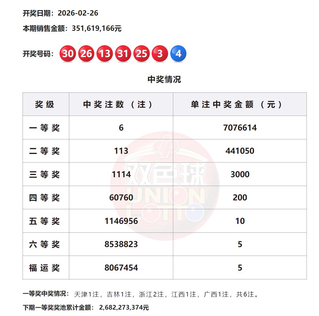 707万大奖!双色球全国6注707万头奖花落多地,浙江2注江西广西天津吉林各1注,二等奖113注44万元,数量相比上期几乎翻倍,但单注依然保持40万以上丰厚水平,毫无疑问二等奖已成新规最大赢家。另外末等奖853万注、福运奖806万注,看来中3+0难度基本和中独蓝差不多,福运奖常态应该也是不会超过1000万注大关啦!