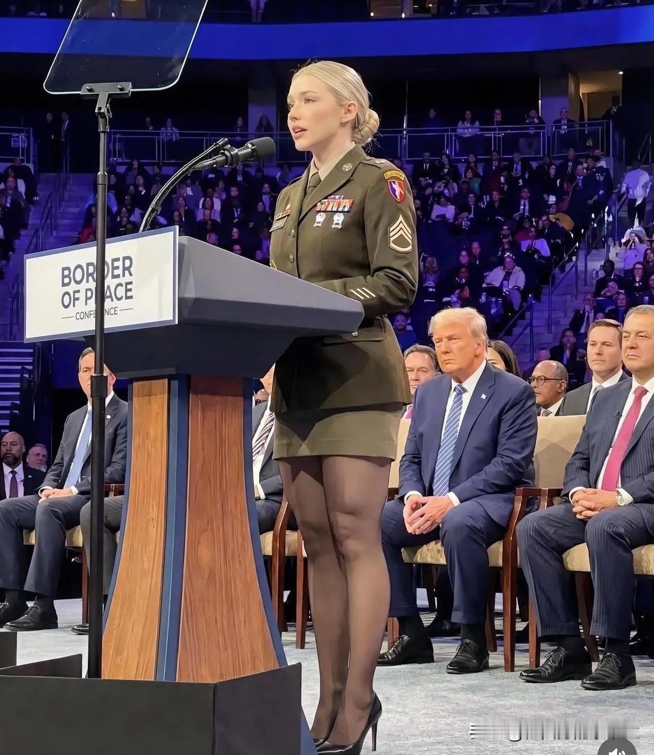 美军士兵能否穿丝袜呢? 有一位容貌姣好的美军女士兵正在演讲台上发言。 她身后坐着
