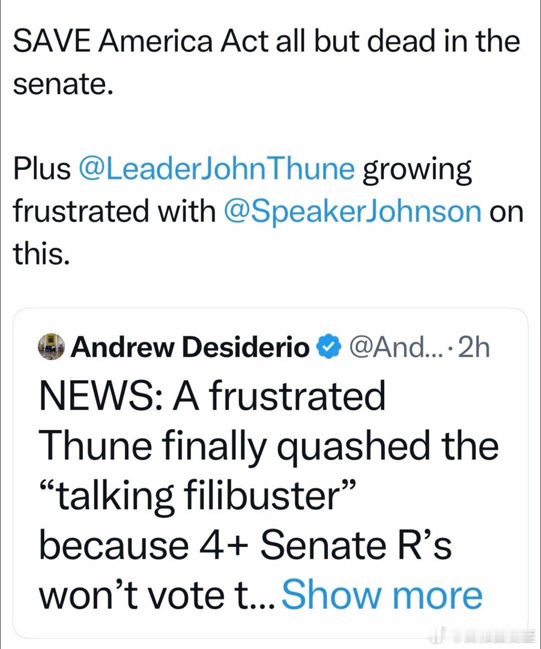 SAVE America法案在参院无法通过至少四名共和党参议员不同意取消fili