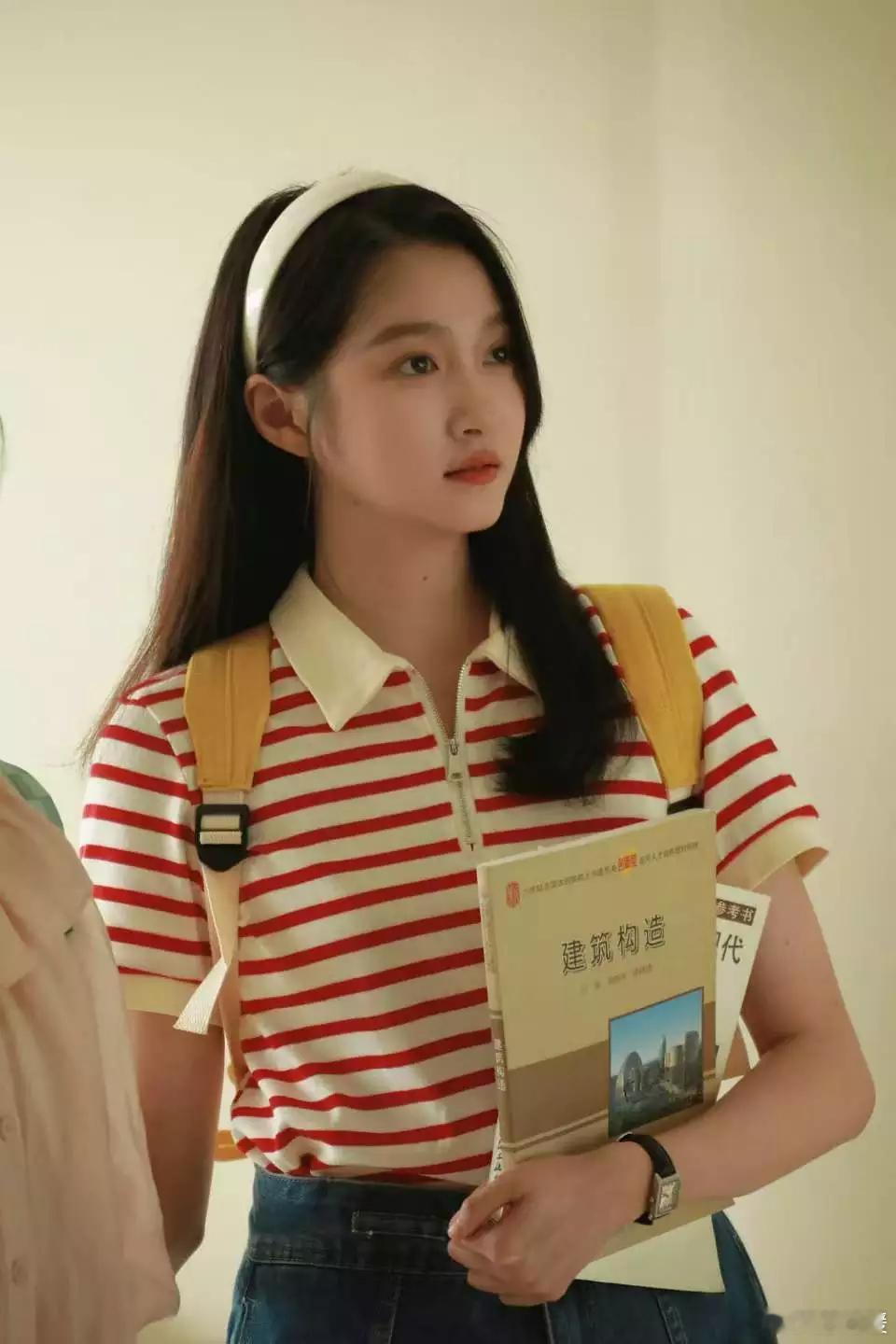 文亦娱乐关晓彤戴发箍抱课本学生气十足 侧颜线条干净气质纯洁