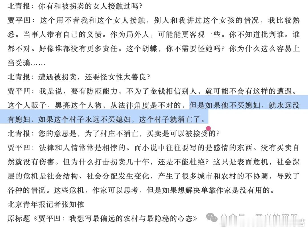 还记得那篇著名的采访吗?当被问及小说中为买媳妇辩护的桥段,他给出了那套惊世骇俗的“村庄消亡论”:“如果他不买媳妇,就永远没有媳妇,如果这个村子永远不买媳妇,这个村子就消亡了。”