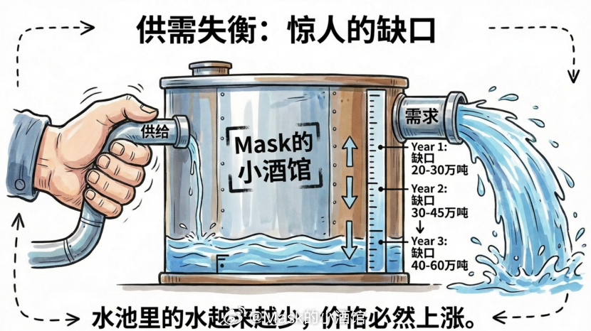 三股力量同时发力,需求端在持续扩张。三、供需失衡:一个惊人的缺口现在把供给端和需求端放在一起看:供给端:印尼减产导致全球镍供应减少20-30万吨。需求端:预计未来几年全球镍需求每年增长10-15万吨。