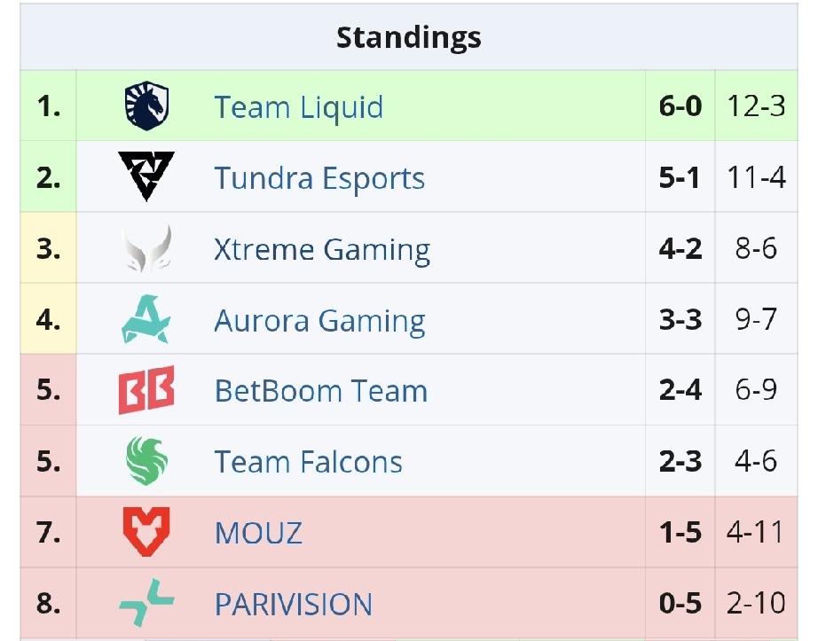 梦幻联赛S28小组赛第二轮第六天赛果 Tundra 2:1 BB,没啥好说的,对XG好,毕竟是竞争对手,不过已经拿了一分。 Liquid 2:1 MOUZ,继续连胜,无敌的李逵 XG 2:1 Aurora,被李逵破金身的欧若拉遭遇三连败,晋级淘汰赛有了 PARI 2:1 Falcons,