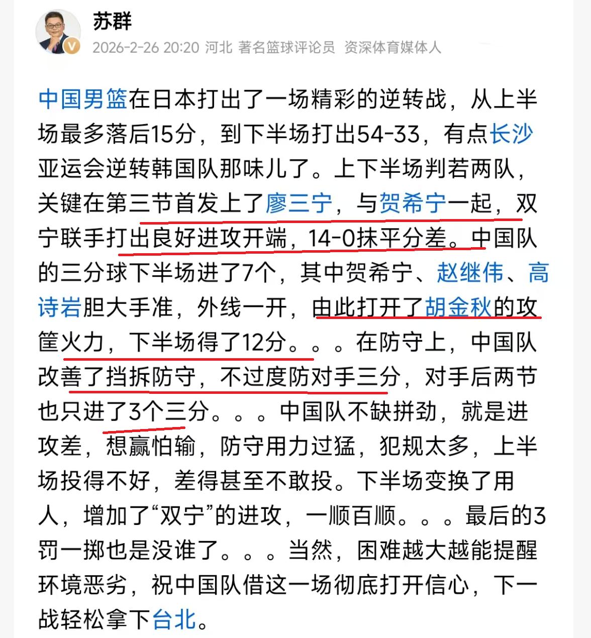 赢日本队7分!苏群中肯点评,道出了中国男篮3大赢球原因 昨晚,2027年世界杯预选赛,中国男篮与日本队的比赛,最终,中国男篮在一度落后15分的情况下,完成了一次超级大逆转,以87-80击败了日本队,笑到了最后。如此一来,中国男篮也是拿到了首场比赛胜利,想要小组出线,也是重新夺回了主动权。 从本场比赛来看,中国男篮在上半场比赛打得十分臭,特别是在进攻端,十分低迷,首节比赛,只得了11分,半场比赛只得了33分, 半场落后日本队14分。然而,到了下半场比赛,中国男篮完全像是换了球队一样,不管是在进攻端,还是在防守端,效率都是十分高,利用第三节比赛,就完成了比分逆转,接下来,中国男篮没有再给对手机会,以7分的优势击败了日本队,收获比赛胜利。 那么,中国男篮为何能够在不利的局面下,完成一次大逆转呢?对于这个问题,国内知名解说员苏群,在赛后也是进行了分析和点评,他认为中国男篮之所以能够逆转赢球,主要有三个方面的因素。 1、苏群认为在第三节比赛,首发使用了廖三宁、贺希宁,双宁联手打出良好进攻开端,很快将14分的差距给抹平。正是郭士强下半场的用人变化,增加了“双宁”的进攻,让球队的进攻变得一顺百顺。 2、胡金秋在下半场比赛迎来了爆发,随着贺希宁在外援投开,让日本队防守外扩,在这样的情况下,胡金秋在内线变得不可阻挡,下半场比赛就砍下了12分,全场比赛,胡金秋砍下了20分12篮板,扛起了内线。 3、防守端改变了方式,下半场比赛,中国男篮不再过度防守三分球,改善了挡拆防守,增加了内线的防守力度,在这样的情况下,日本队三分球,也没有什么起色,下半场也只进了3个三分球,同时,日本队篮下进攻,变得十分低迷。 至于中国男篮上半场比赛,为何表现如此之糟糕,苏群认为还是进攻太糟糕,球员想赢怕输,防守端用力过猛,导致犯规太多,由于投篮不好,搞到大家都不敢投了。讲简单一点,那就是球员思想压力太大,怕再一次输球,没有发挥出自己的水平。 实话实说,苏群所言,也是指出了中国男篮的问题所在,毕竟,此前连续输给韩国队,造成了巨大的心理压力。相信,球队此番击败日本队,能让球队得到释放,能够打好后面的比赛。