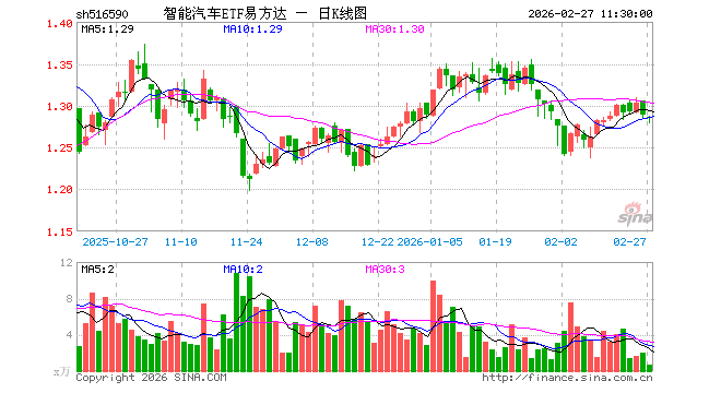 2月27日,截止午间收盘,智能汽车ETF易方达(516590)跌0.31%,报1.285元,成交额88.34万元。智能汽车ETF易方达(516590)重仓股方面,宁德时代截止午盘跌0.55%,比亚迪跌0.70%,立讯精密跌2.15%,三花智控跌1.41%,汇川技术跌0.60%,赛力斯涨0.25%,豪威集团涨0.51%,亿纬锂能跌0.68%,拓普集团跌2.25%,华友钴业涨0.39%。