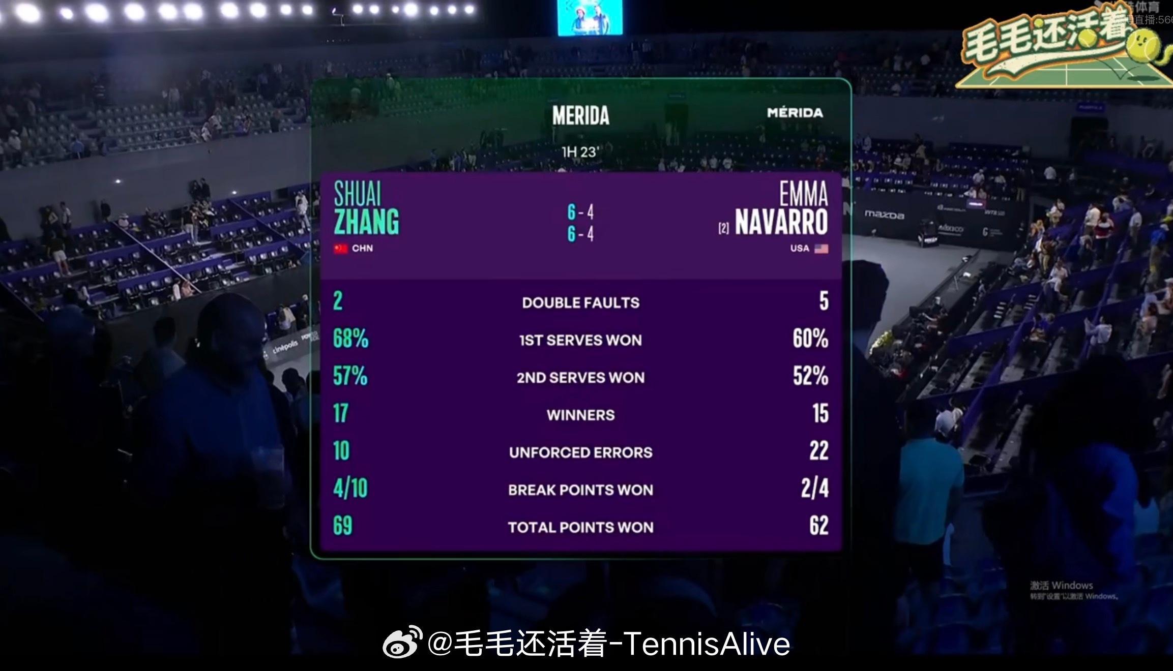 恭喜张帅2个6:4击败卫冕冠军纳瓦罗晋级WTA500梅里达站八强。纳瓦罗痛失44