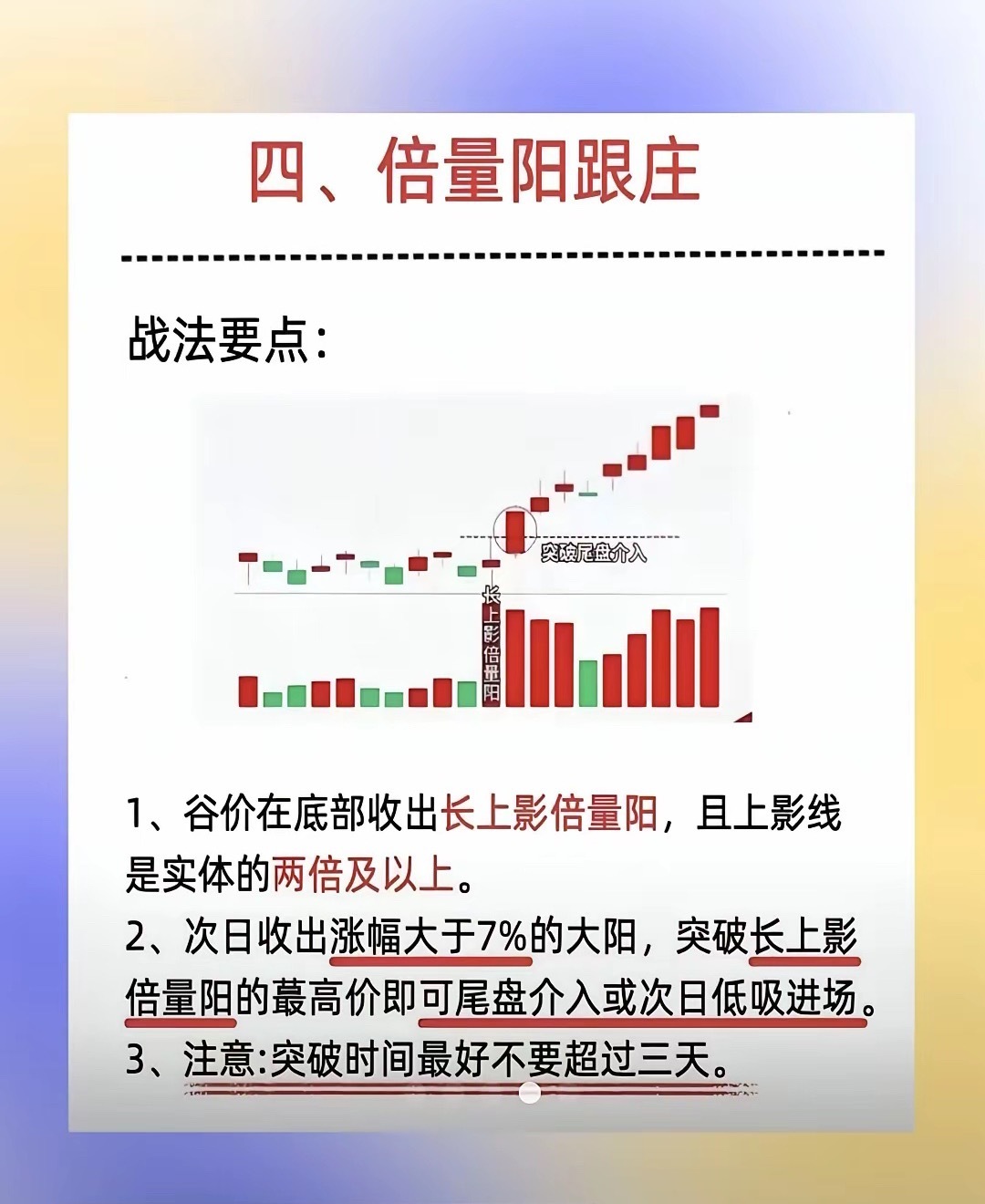 倍量阳跟庄一句话口诀:倍量出阳线,主力在干活,缩量回踩就上车一、什么是「倍量阳」当天阳线成交量 ≥ 前一天成交量 2倍- K线:中阳/大阳,实体明显,最好收在高位- 位置:低位横盘后、上升途中,不是高位巨量二、跟庄核心逻辑- 倍量阳 = 主力主动吃货、试盘、拉升- 后面缩量回踩 = 洗盘,不跌破倍量阳1/2或5日线- 目标:吃主力洗盘后的主升段三、入场条件1. 出现一根标准 倍量阳线2. 随后 1–3天缩量回调3. 回踩不破倍量阳开盘价/最低价,企稳翻红4. 5日线仍向上买点:- 回踩企稳时低吸- 重新站上分时均线加仓四、止盈止损- 止盈:连续大阳、冲高乏力、放量长上影减仓- 止损:跌破倍量阳最低价 / 有效跌破5日线,离场五、简单口诀记牢倍量阳,是信号,缩量回踩是机会。不破低点大胆跟,破位止损不恋战。