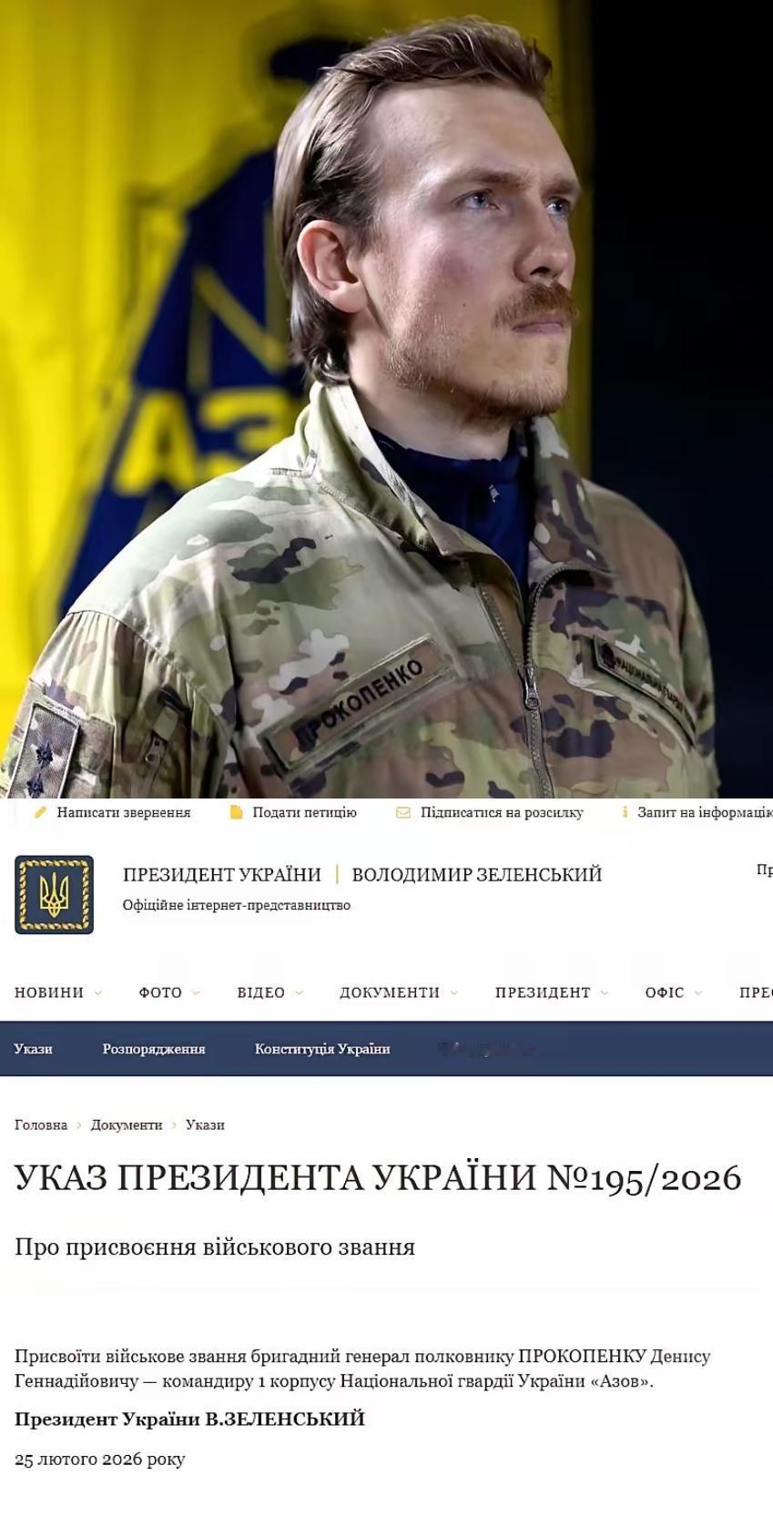 恭喜!乌克兰34岁“战神”晋升准将,俄罗斯去纳粹化彻底白干了! 泽连斯基这波操作真的太“高明”了!直接一纸总统令,把34岁的亚速营指挥官普罗科彭科提拔成准将,妥妥的乌军最年轻将军,一路开挂人生直接封神! 不得不说,乌克兰太懂“知恩图报”了。这位大哥当年在马里乌波尔一战成名,堂堂正正走进俄罗斯战俘营,转头交换回国直接重用,从旅长到军长再到将军,升职速度比坐火箭还快。 更绝的是,乌克兰还顺势把所有民兵、武装力量全部正规化统一化,曾经的亚速营直接“洗白转正”,从民间武装摇身一变成正规王牌,这波操作简直满分! 俄罗斯当初进场喊着要去纳粹化,点名要收拾的就是亚速营,结果呢?人家不仅没消失,反而官越做越大,兵越练越强,编制越来越正规。俄罗斯越反对什么,乌克兰偏要干什么,你说气人不气人? 一边是俄罗斯坚持的去纳粹化目标,一边是乌克兰把核心人物一路提拔到将军,把争议武装彻底扶正合法化,对比下来简直不要太讽刺。 泽连斯基用实际行动证明:你越不让我做,我越要做到极致,主打一个公开对着干! 就想问,俄罗斯看到这一幕,心里是啥滋味?这去纳粹化,到底是成功了还是彻底失败了? 乌军时间表 乌军高征兵年龄