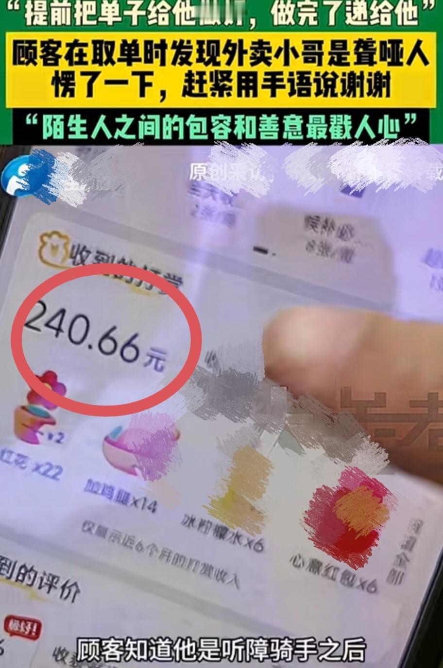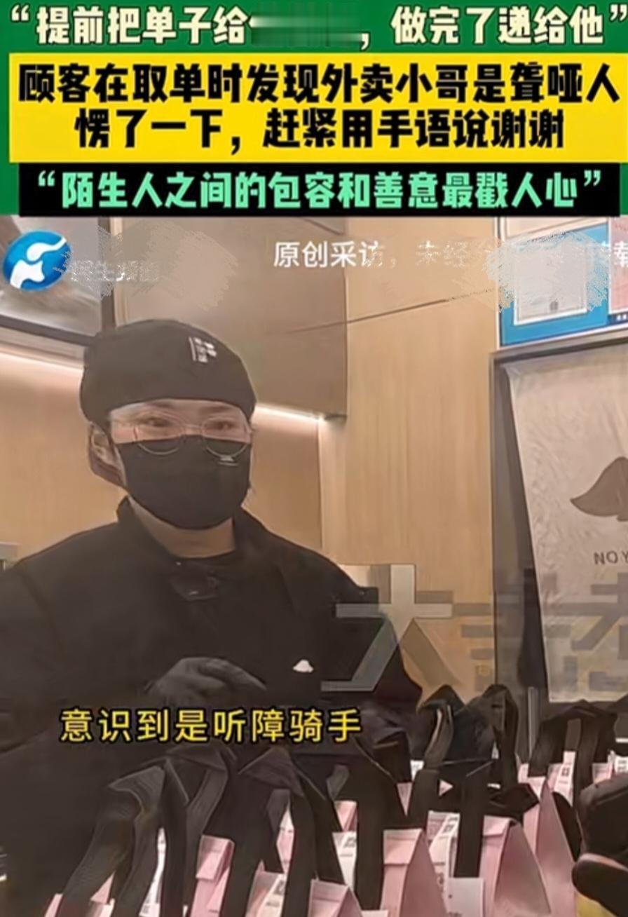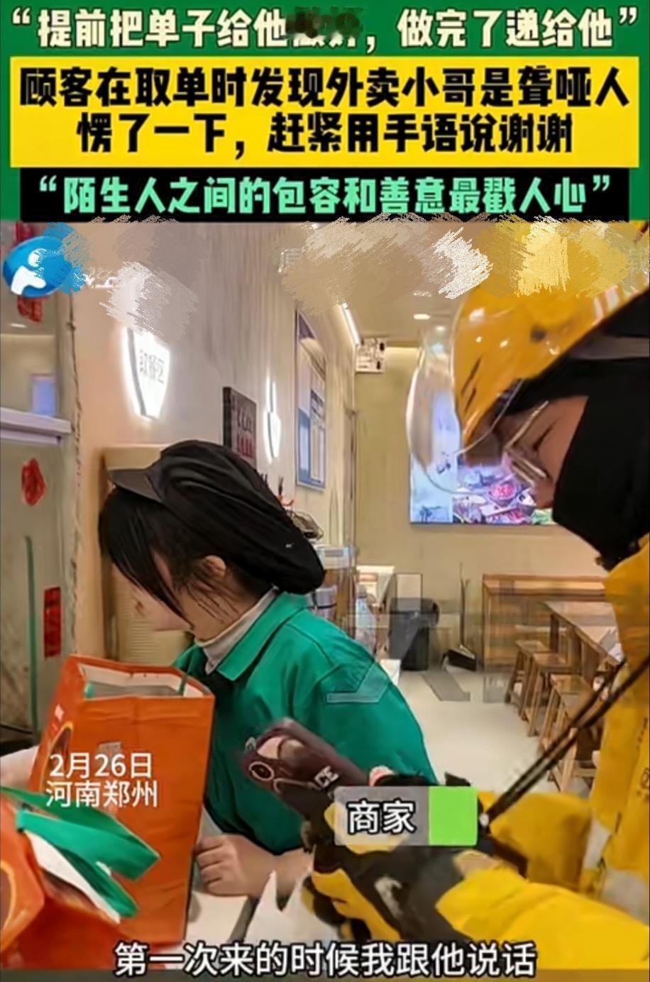 河南郑州,年轻骑手来到商家取餐窗口,没说一句话只顾着找外卖。工作人员见他找不到餐,便关心问起来:“你好,你取几号餐?” 一句问话瞬间石沉大海,工作人员以为是骑手太专注,压根没注意他的问话。 “你好,你取哪个餐?我帮你找找!”工作人员第二次明显将声调调高,再一次关切问道。 然而,工作人员又一次吃了“闭嘴羹”,表情略显尴尬但又无可奈何,毕竟微笑服务才是服务的灵魂。 过了一小会,骑手因找不到餐终于将目光转向了刚才这个工作人员。 工作人员本以为他要开口,可让他始料未及的是,骑手用手比划来比划去。原来如此,工作人员这才意识到骑手是听障人士。 找到了原因,工作人员的尴尬瞬间消失殆尽,非常热情地帮骑手找餐。找到后,工作人员双手递上,并说声“慢走”。 有了这一次,以后但凡再遇到这个听障骑手,店内所有工作人员很热情为其服务,但凡有他的外卖,商家都会第一时间出餐,好让他送得放心。 就在几天前,骑手又一次前来取单,工作人员不仅提前出餐,同样还是双手给递了上去。骑手觉得很欣慰,连忙用手语表示感谢。 不过,这一次商家有了意外发现。骑手到地后将外卖递给顾客,又用手语表示“用餐愉快”。 顾客顿时明白了咋回事,接过来立刻用手语表示“感谢”。 这还没完,顾客觉得这个听障骑手太不容易,心地善良的他在后台打赏了200多块钱。这让骑手欣喜若狂,顿时觉得人世间竟然如此美好。 没错,来自陌生人之间的包容和善意最戳人心。 回头再看,工作人员热情服务,细心关照,这不仅仅是岗位需要,更是发自肺腑的态度以及善良友爱的本性。 顾客用红包表示感谢,无可厚非,顾客多么善良,知晓人情冷暖,可谓是好心人遇到了好心人。 这个世界压根不缺善良,更不缺爱心,人与人交往,就应该如此。将爱心传递下去,把温暖送给他人。 你会发现,这样的世界会更加美好,如诗如画。老铁们,您说呢?