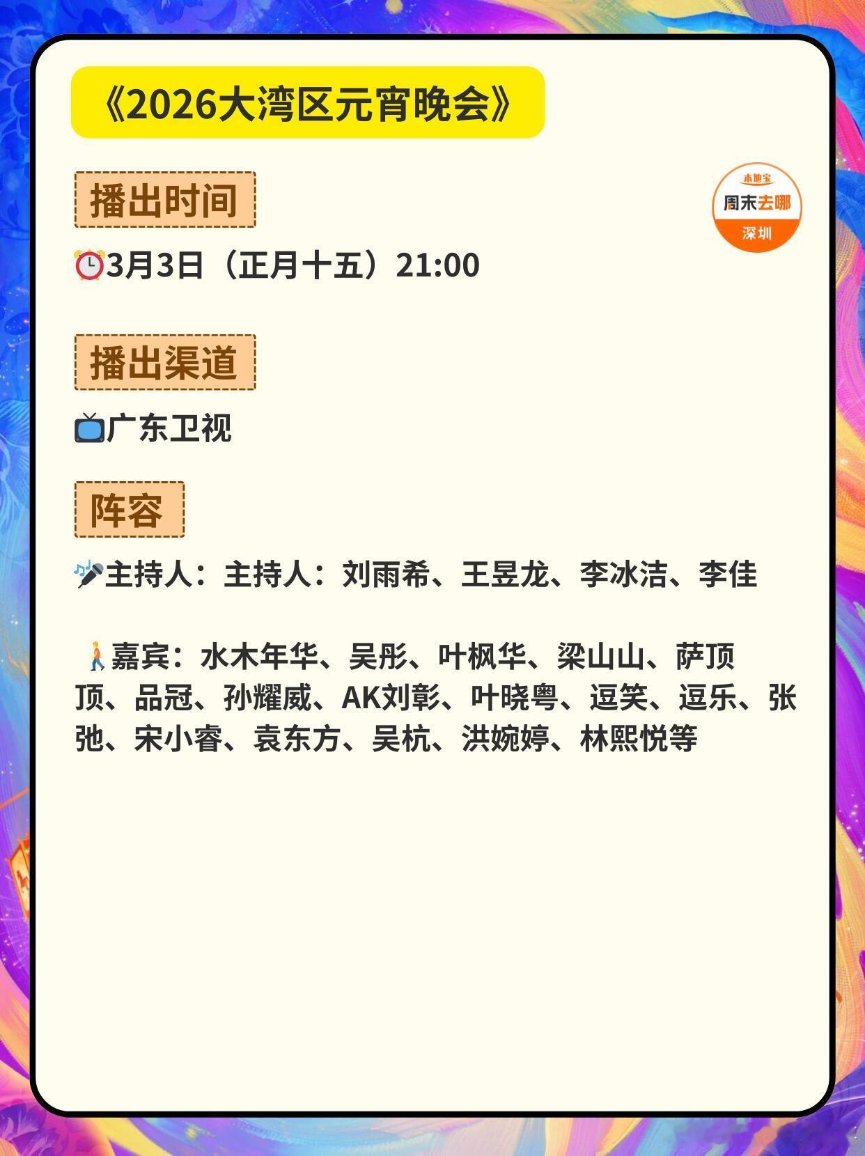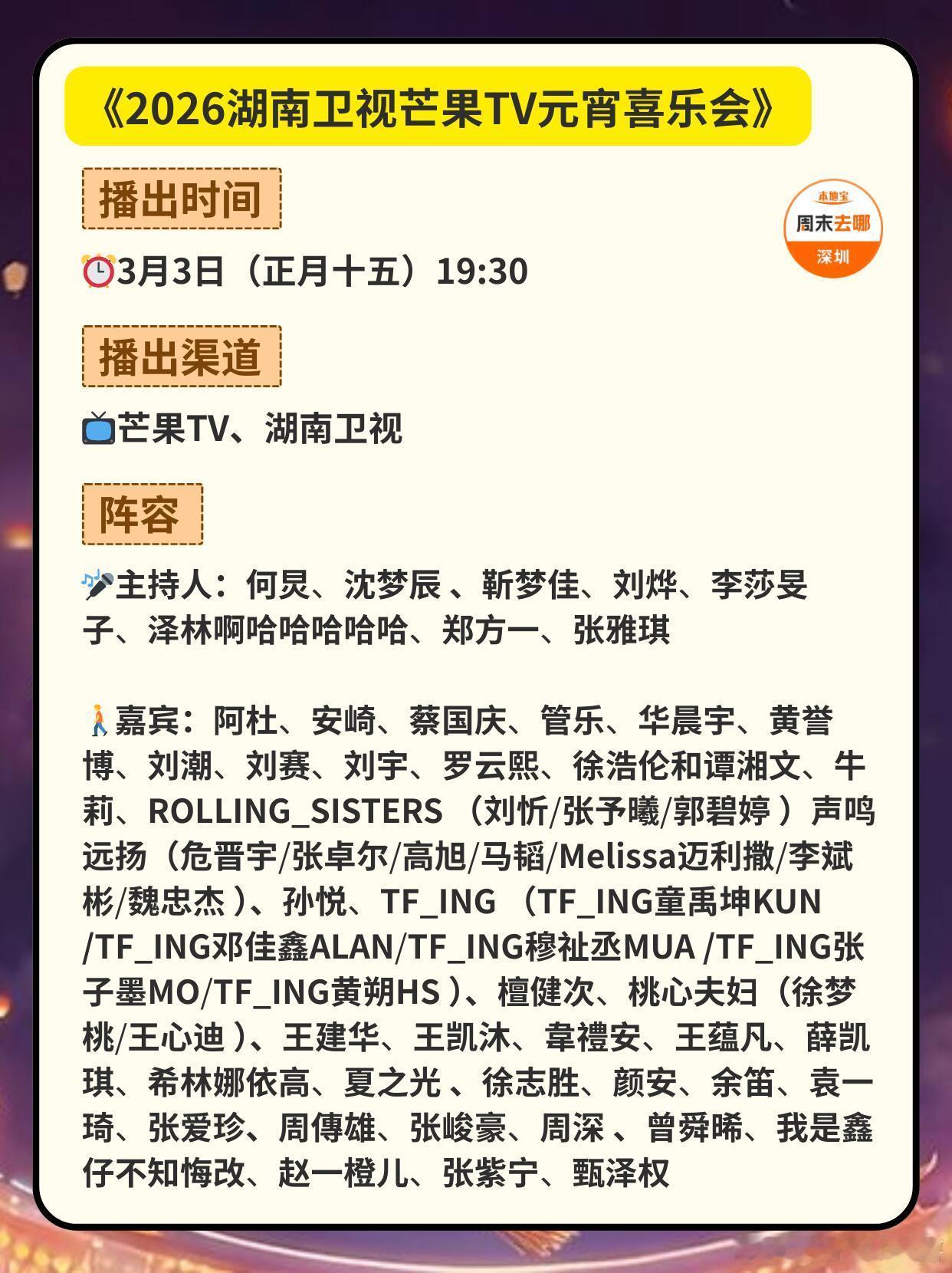 ☑️《2026湖南卫视芒果TV元宵喜乐会》⏰播出时间:3月3日(正月十五)19:30📺播出渠道:芒果TV、湖南卫视🎤主持人:何炅、沈梦辰 、靳梦佳、刘烨、李莎旻子、泽林啊哈哈哈哈哈、郑方一、张雅琪🚶嘉宾:阿杜、安崎、蔡国庆、管乐、华晨宇、黄誉博、刘潮、刘赛、刘宇、罗云熙、徐浩伦和谭湘文、牛莉、ROLLING_SISTERS (刘忻/张予曦/郭碧婷 )声鸣远扬(危晋宇/张卓尔/高旭/马韬/Melissa迈利撒/李斌彬/魏忠杰 )、孙悦、TF_ING (TF_ING童禹坤KUN /TF_ING邓佳鑫ALAN/TF_ING穆祉丞MUA /TF_ING张子墨MO/TF_ING黄朔HS )、檀健次、桃心夫妇(徐梦桃/王心迪 )、王建华、王凯沐、韋禮安、王蕴凡、薛凯琪、希林娜依高、夏之光 、徐志胜、颜安、余笛、袁一琦、张爱珍、周傳雄、张峻豪、周深 、曾舜晞、我是鑫仔不知悔改、赵一橙儿、张紫宁、甄泽权-☑️《2026大湾区元宵晚会》⏰播出时间:3月3日(正月十五)21:00📺播出渠道:广东卫视🎤主持人:主持人:刘雨希、王昱龙、李冰洁、李佳🚶嘉宾:水木年华、吴彤、叶枫华、梁山山、萨顶顶、品冠、孙耀威、AK刘彰、叶晓粤、逗笑、逗乐、张弛、宋小睿、袁东方、吴杭、洪婉婷、林熙悦等-☑️《2026江苏卫视ai荔枝元宵晚会 》⏰播出时间:3月3日(正月十五)20:30📺播出渠道:江苏卫视、ai荔枝🚶嘉宾:蔡国庆 、希林娜依高、黄子弘凡、林依轮 、刘宇、苏见信(信)、小鬼-王琳凯、喻言、小阿七(陈悦)、迈利撒、汤非、田佳鑫、王蓉、王弦、魏子越、云飞、张浩天、李好、张纯烨、李响、郭晓敏、王晓亚、王珏、孙嬿婉、洪超等