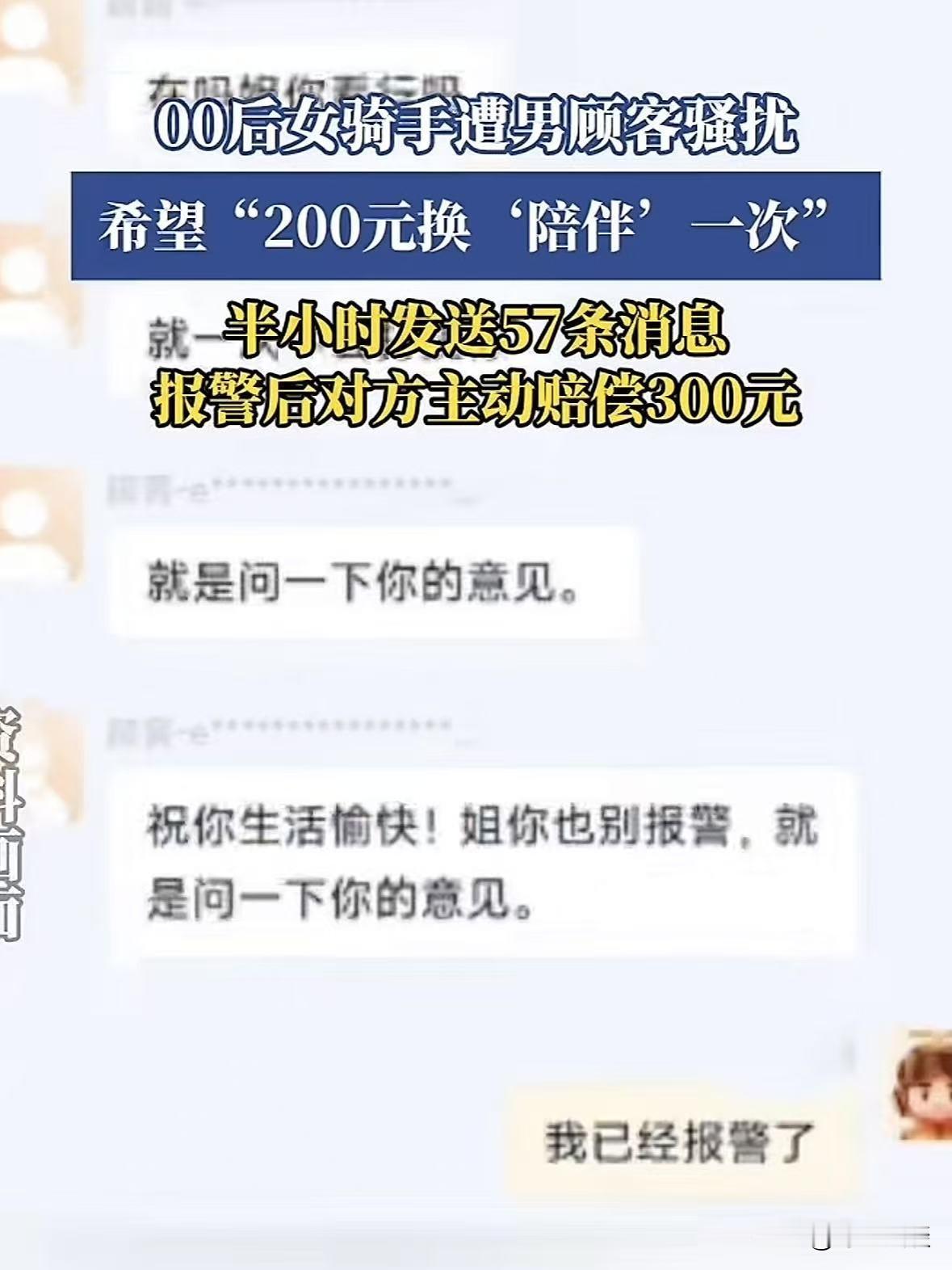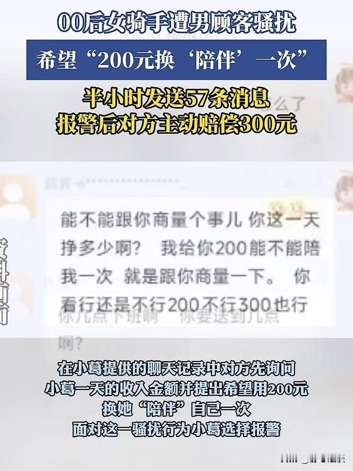上海,女外卖员送外卖时,发现男顾客站在在门口等她,以为对方着急,紧着跑两步把东西送到对方手里,随后转身下楼,没想到刚下楼,手机就响了,打开一看是刚才那个男顾客,问女外卖员几点下班,200块钱能不能陪一宿,嫌少300也行,女子觉得男子有病,没理他,结果男顾客半小时连着发了57条,把女外卖员逼疯了,一气之下报了警!女外卖员:我送外卖,不卖尊严! 手机还在疯狂震动,57条未读消息炸得女外卖员小葛心烦意乱。 她咋都没想到,自己不过是爬楼送了一份外卖,就被人用最不堪的话,连续骚 扰。 当天傍晚六点,正是晚高峰的时候,小葛骑着电动车在车流里钻来钻去,订单催得紧,她连喘口气的功夫都没有。 送到那个老小区时,单子上写着五楼,无电梯。 她没多想,不就是爬楼梯,费点力气,干啥不累,她拎着餐盒就往上跑。 可刚爬到五楼楼梯口,小葛心里猛地一紧,有个20来岁的小伙站在门口。 她以为对方着急,紧赶几步把东西送到对方手上,可对方眼神直勾勾地落在她身上,说不出的别扭。 小葛并为多说,把外卖递过去转身就往楼下冲。 她做骑手这么久,一向懂分寸、懂自保,从不跟顾客多说一句话。 可她刚下楼,手机就来了消息,小懂以为是懂送的外卖有问题,便回复问怎么了? 结果小伙直接问了句:姐,你几点下班?一天能赚多少?小葛见状忙着赶单,没理他,放下手机就继续送单。 她以为不理就会结束,却没想到,这只是噩梦的开始。 短短半个小时,57条消息,一条接一条轰炸,手机震得她手心发麻,提示音吵得她心神不宁。 她一边骑车,一边被消息干扰,过马路时余光一瞥,电动车猛地一歪,差点撞车,冷汗瞬间湿透了后背。 她打开手机一看信息,消息内容把她气的不行,那男的说:我给你200块,陪我一次行不行。 你要嫌少300也行,就一次,我就不打扰你,还说姐你别报警。 小葛看着信息气得胸口发闷,她风里雨里跑单,靠力气赚钱,干干净净,凭什么被人这样侮辱。 小葛忍着气把最后一单送完,拿起水机没有丝毫犹豫直接报了警。 然后冷冷给那个男的发了一句我报警了。 她不要道歉,不要赔偿,什么都不要,她就要一个公道:你骚 扰我,就必须付出代价。 警察跟着她一起上门时,刚才还不停发消息的小伙瞬间蔫了。 小伙当场慌得不停道歉,主动拿出300块钱,求她原谅、求她私了。 小葛本来一分钱都不想要,可她最后还是收下了,她觉得这钱也是给你长记性,记住了别随便骚扰别人。 《民法典》第1010条:违背他人意愿,以言语、文字、图像、肢体行为等方式对他人实施骚扰的,受害人有权依法请求行为人承担民事责任。 小伙用文字发送暗示、交易提议,违背小葛意愿,已构成骚 扰,小葛有权要求道歉、赔偿、追究责任。 《治安管理处罚法》第42条:多次发送侮辱、恐吓或者其他信息,干扰他人正常生活的,处5日以下拘留或者500元以下罚款。 情节较重的,处5日以上10日以下拘留,可以并处500元以下罚款。 男子半小时发57条骚扰信息,严重干扰骑手工作与出行安全,警方可依法处罚。 后来这事被发到网上,网上有人说她小题大做:不回消息不就行了,至于直接报警吗? 小葛说:我是跑外卖的,但我不卖尊严。 女孩子被骚扰,一点不丢人,丢人的是那些动手动脚、满嘴脏话的人,凭什么要忍! 而那个20岁的小伙子,算计了半天,钱赔了,人丢了,还被警察狠狠教育一顿。 真应了那句老话:偷鸡不成蚀把米,没了底线,到头来只会输得一败涂地。 尊严这种东西,从来不是用钱能买的,你不尊重别人,迟早要为自己的轻浮和无礼买单。 对此,你怎么看这件事! @静心法谈 学法辨是非,慬法不吃亏。