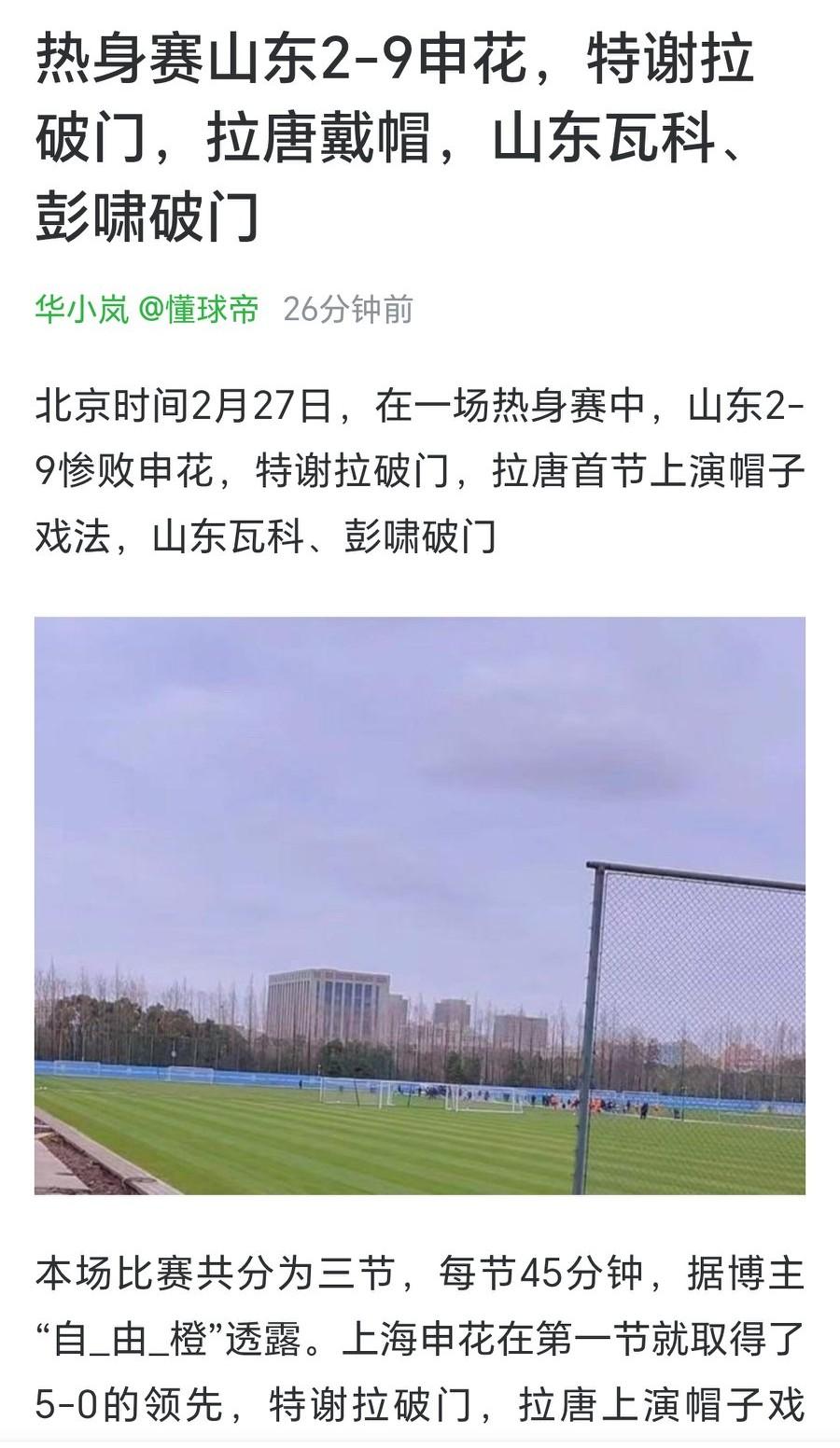 山东泰山2-9上海申花,特谢拉破门,拉唐戴帽,山东瓦科、彭啸破门! 虽然这是热身赛,但是也不能输这么多。不过申花踢了两场亚冠,状态正盛,也有人说,辽宁铁人教练组的人在现场,而山东泰山队中超第一轮对阵就是辽宁铁人,防止战术泄露,这样就合理了,总之得给一个安慰的理由! 另外还有就是,德尔加多踢后腰,被进这么多,一点不奇怪! 还有就是阿尔瓦罗没有上场,根据媒体人牛志明消息,因为到队比较晚,一直在恢复训练,处于保护状态! 山东泰山队