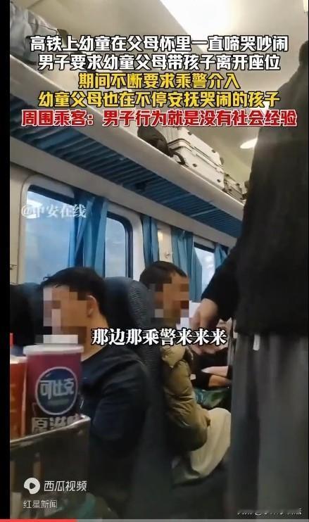 江西,一正在行驶的高铁上,一对夫妇带着一个幼童坐在座位上,不知幼童出现了什么状况,一直啼哭吵闹,哭的嗓子都快哑了,妈妈急得不知所措,换着法安抚孩子。一男子被吵得有些暴躁,起身指责这对夫妇,让他们离开座位出去,说当妈的护着孩子,当爸的总知道这个道理吧?你们俩动不动,动不动我问你?不断喊乘警过来管一管!男子态度咄咄逼人,非常愤怒。周围乘客:男子行为就是没有社 会经验! 2月25日江西的一趟高铁上,一段因幼童哭闹引发的争执,让车厢里的气氛瞬间变得紧张,也让周围乘客纷纷侧目。 高铁疾驰在轨道上,车厢里原本还算安静,只隐约有乘客的轻声交谈和列车的轻微响动,直到一阵幼童的啼哭声打破了这份平静 孩子被父母紧紧抱在怀里,小脸涨得通红,哭声一声接着一声,听着格外揪心。 孩子的父母也不知孩子哭闹的原因,换着各种方法安抚孩子,他们一刻也没闲着,爸爸轻轻拍着孩子的后背,妈妈柔声细语地哄着,时不时还轻轻晃着胳膊,想尽办法想让孩子安静下来。 他们脸上满是焦急和无奈,额角甚至冒出了细汗,生怕孩子的哭声打扰到身边的人。 可幼小的孩子并不懂这些,他依旧嗷嗷大哭,两个年轻的父母急得不知所措,两人倒换着安抚。 可这份焦急和努力,在旁边一位男乘客看来,却远远不够。 孩子的哭声持续了一阵子,这位男子便坐不住了,脸上的神情越来越烦躁,眉头拧成了一个疙瘩,时不时用力叹着气,身体也坐立难安。 终于,他忍不住站起来,对着孩子父母发难,语气带着明显的不满和强硬,要求夫妻俩带着孩子离开座位,别在这影响其他人。 孩子父母连忙解释,说孩子太小不舒服,正在尽力安抚,可男子根本听不进去,情绪越来越激动,一遍遍朝着车厢那头喊乘警:乘警过来过来,管一下来! 远处乘警回应说:等一下! 可那个男子很不耐烦:都叫你3遍了,快一个小时了! 他又对着另一面喊:那边的乘警快过来管一下,你管还是不管吗? 他还对着孩子爸爸质问:他妈护着孩子,你当爸的总知道这点道理吧?动不动你,你就说你俩动不动吧?大人就应抱着小孩过去,你大人是干啥的?不然高铁不会有静音车厢! 那咄咄逼人的态度,就好像你不动,他就想动手打人似的!让周围的空气都仿佛凝固了。 眼见着双方的争执越来越激烈,旁边的乘客看不下去了,纷纷出言劝解。 有人拉了拉男子的胳膊,轻声说:可以了,你看现在孩子都没哭了,别太较真了。 还有人帮着孩子父母说话:大人一直抱着孩子哄呢,这是最基本的道理,况且这也不是静音车厢,小孩子哭闹难免的。 还有乘客私下议论,说这男子就是太年轻了!可有乘客说:不是太年轻,就是没有社 会经验!根本不懂带娃的难处,对小孩子也太没包容心了。 孩子父母本就满心愧疚,被男子这么一指责,更是手足无措,只能更加用力地抱着孩子,低声哄着,眼神里满是委屈,没去与男子争吵! 好在乘警很快赶到,了解了事情的来龙去脉后,对双方进行了调解,一边安抚男子的情绪,一边也跟孩子父母沟通,让他们尽量多留意孩子,避免哭声再次影响他人,这场争执才算是暂时平息。 这件事也引发了网友的热议,不少网友表示,男子的态度实在太咄咄逼人,一点小事就不依不饶,显得缺乏基本的教养和包容心。 也有网友纷纷共情孩子父母,直言婴幼儿哭闹本就无法完全控制,父母已经在尽力安抚,旁人多一点理解和宽容,远比一味指责更重要。 出门在外,每个人都难免遇到各种突发状况,尤其是带着孩子的家庭,本就多了许多不易。多一份换位思考,少一份苛责计较,车厢里的氛围,才能多一份温暖和和谐。 有人说,我也很讨厌火车上孩子哭闹,但如果孩子监护人一直在安抚,那我再烦也会选择忍让,毕竟孩子还小,而且监护人也并没有放任不管 有人说,嫌别人吵怎么不去买商务座,别人在尽到照看义务的情况下无可厚非! 这是孩子父亲脾气好的,遇到暴脾气的,指定干仗了!孩子哭闹大人够上火了,他还火上浇油! 还有人说,如果我是乘客,我会忍耐!如果我是家长,我会自觉带孩子到两节车厢处安抚,而不是坐在座位上安抚,影响其他人! 您遇到这样的事,会怎么做?