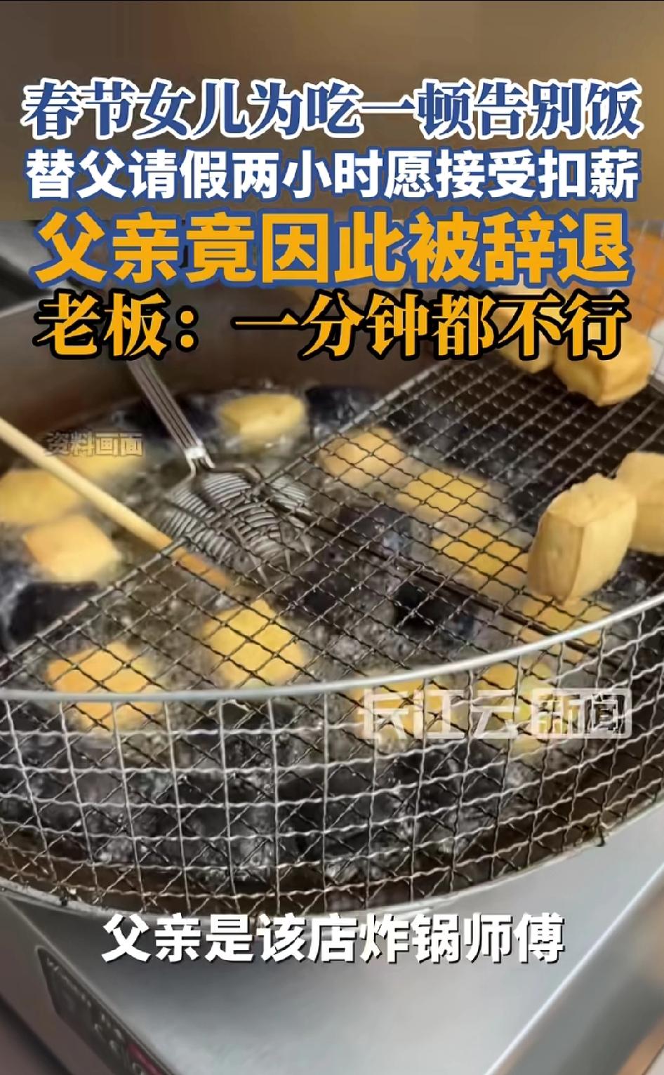 一分钟都不行!济南一臭豆腐师傅想陪返程女儿吃2小时告别饭,女儿主动打电话沟通,愿意不要工资、给补偿,老板直接拒绝并威胁辞退,没想到师傅还是去陪了女儿,可第二天竟真的被直接开除,网友怒了:实在太不近人情! 2026年春节刚过,济南宽厚里人来人往,热闹非凡。 54岁的炸锅师傅在这家臭豆腐店工作近3年,有着30年小吃制作经验,手艺扎实、手脚麻利,高峰期一天能炸40‑50筐臭豆腐,只知道埋头苦干,是店里最让人放心的老员工。 整个春节假期,他只在大年三十休息了1天, 每天上班开始一直忙到凌晨1点收摊,长时间守在滚烫的油锅前,被油烟和热气裹着,一站就是十几个小时,累了就悄悄直一下腰,渴了就喝一口凉水,从不多抱怨一句。女儿从杭州回来过年,整整10天,父女俩真正安安静静坐下来吃顿团圆饭的机会,只有匆匆一次。 2月21日晚上9点多,店里客流渐渐散去。 女儿知道第二天一早就要赶回杭州,心里又不舍又难过,犹豫了很久,才主动、客气地拨通了老板的电话,想为父亲请短短2个小时的假,好好吃一顿告别饭。她声音轻柔、态度诚恳,还主动退让:这两小时工资可以一分不要,也愿意补偿店里损失,只希望老板能体谅这份父女情。 可电话那头,老板的语气冷硬得没有一丝余地, 只冷冰冰甩出一句:“不可能,一分钟都不行”,话音未落,便狠狠挂断了电话。 没过几秒,老板的电话直接打给了师傅,语气带着明显的威胁:你要是敢去吃这顿饭,明天就别来上班了! 师傅握着手机,指节微微泛白,站在空荡荡的店门口,心里又酸又涩,半天说不出话。 一边是干了三年的工作,一边是即将远行的女儿。 他最终还是不想留下一辈子的遗憾,咬了咬牙,还是去陪女儿吃了那顿短暂又珍贵的告别饭。 2月22日一早, 老板果然说到做到,当天就以“不服从管理”为由,当场将师傅直接辞退。 之前春节加班的加班费一分没结,该给的补偿半毛没有,说得理直气壮,没有半点愧疚。 师傅站在店里,看着自己守了三年的灶台,双手微微颤抖,心里一片冰凉,辛苦付出三年,最后连一点人情味都没换来。 女儿得知父亲真的被辞退,又气又心疼,眼泪在眼眶里打转, 当天就赶到店铺前,拿着证据和老板认真理论,只想为父亲讨一个公道。 她声音带着委屈,却依旧保持克制,只是诉说事实,没有吵闹,没有过激言行。 这一幕被路人拍下视频发到网上,瞬间戳中无数人,迅速引发全网关注与同情。 网友们纷纷表示愤怒又心酸: 打工人也是人,也有家人,也有割舍不下的亲情! 春节连轴转、熬夜苦干,就两小时假都不肯通融,实在让人寒心。 舆论发酵后,老板曾主动联系协商,却只愿意补偿1个月工资, 对辞退的赔偿金、拖欠的加班费一概不提,被女儿当场拒绝。她坚持要走合法途径,维护父亲应有的权益。 2月26日,济南市人社局已正式介入调查, 女儿也已委托律师,准备提起劳动仲裁,依法追要违法解除劳动合同赔偿金、春节三倍加班费、未休年假工资等合法权益。 做人可以讲规矩,但不能没温度。 凉了打工人的心,再火的生意也做不长久。你觉得老板因为两小时假就开除老员工,合理吗? 打工人的心酸职场维权真实事件社会正能量#晴风语说事 消息来源:长江云新闻 及网络公开内容,本文配图/视频素材来自@ 长江云新闻 ,以上仅用于内容分享,侵权即删,谢谢!