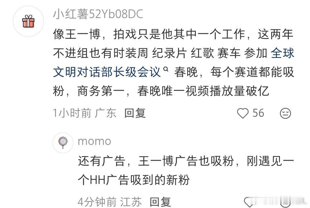 最近有网友提问:“现在内娱不拍戏流量会下滑吗?”评论区瞬间被王一博的名字刷屏。有粉丝直言:“像王一博这种个人魅力满满的顶级明星,拍戏仅仅是他的工作之一,他不拍戏,流量照样顶,一出来照样爆。”确实,这两年王一博虽未频繁进组,但他的热度从未降温。从惊艳全球的时装周大秀,到热血燃炸的赛车赛场,再到登上春晚舞台的破亿播放量舞台,甚至是代表青年参与全球文明对话部长级会议,每一次亮相都能引爆全网讨论。更让人惊叹的是,他的商务价值依旧断层第一,就连一支广告都能轻松吸粉无数。有网友分享:“刚遇见一个因为HH广告入坑的新粉。”有人说,王一博就像当年的香港四大天王,是真正的多栖全能艺人。他早已跳出“演员”的单一身份,在音乐、舞蹈、赛车、时尚等多个赛道全面开花,用实力证明:真正的顶流,从不需要靠一部剧续命,而是靠无可替代的个人魅力和持续输出的优质内容,牢牢占据内娱的顶流位置。当其他艺人还在为一部剧的热度焦虑时,王一博早已用实力证明:不拍戏,他依然是内娱热度断层第一的王者!