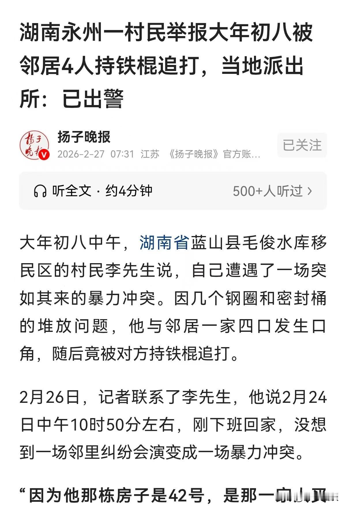 挨打冤不冤?湖南永州,男子邻居买的房空置好几年,他便将家中的钢圈、密封桶等杂七杂八的东西对方在邻居院子里。谁知大年初八,邻居家回来人嫌他私自往家里乱放东西,男子没好气,声音有些大让孩子去搬,邻居觉得这分明冲自己发火,便与他争执起来。随后发生肢体冲突,动起了棍棒,男子后来发现对方来了4个人,每人拿着钢管打他,把他打得晕头转向住进了医院。男子认为打人是有预谋的,可报警却没抓人?网友:你牛皮哄哄,大声埋怨,这顿打是自找的! 50多岁的李先生的隔壁邻居42号房屋是蒋家,他家房子购买后,空置有两三年没住人了。 李先生觉得他家一直闲置着,空着也是空着,为自家院落利索宽敞些,他就把院中的钢圈、密封桶等杂七杂八的东西收拾收拾都堆放在蒋家院子里。 这一放就是好长一段时间,他也没跟蒋家打声招呼。 2月24日上午10点50分左右,李先生刚结束工作回到家中,本想好好休息片刻,却没想到一场冲突正在等着他。 这天,蒋家人突然回来,表示要入住,让李先生把堆放在门口的东西全部搬走。 但对方话里话外说杂物怎么能对外他家院子里? 李先生心里也明白,占用别人的地方确实不合适,当即就安排家里的孩子去搬东西。 他自认为态度十分诚恳,没有骂人,也没有故意刁难,只是双方沟通时语气稍微重了一点,说话声音大了些。 他说自己吵孩子,让他们将东西搬走,这事就完了,谁知对方的情绪远比他想象的更加激动。 短短几分钟后,矛盾就彻底爆发了。 根据李先生提供的监控画面显示,10点54分,双方争吵几句后,两名穿着背心的男子突然上前,率先对李先生动手。 紧接着,另外两名男子也迅速冲了上来,四人一起围上来与李先生扭打在一起。 周围的村民听到激烈的吵闹声和打斗声,连忙跑过来劝架,费了很大力气才将双方拉开。 此时场面已十分混乱,有人已拿起了木棍,稍有不慎就会再次爆发冲突。 李先生以为,经过村民调解,事情总算可以告一段落,可更恶劣的行为还在后面。 11点04分左右,就在双方被分开没多久,蒋家四人再次发难。其中一人竟然跑了将近一公里远的住处,取回四根一米多长的钢管,分给其他三人。 四人手持钢管,气势汹汹地冲向李先生,明显是要进行报复式殴打。 李先生根本来不及反应,就被四人围堵攻击。有人狠狠掐住他的脖子,让他无法呼吸;有人抬脚用力踹他;还有两人直接挥舞钢管打在他身上。 混乱中,李先生被狠狠推倒在地,头部、背部、手臂等多处被打伤,疼痛难忍,几乎失去反抗能力。 一旁劝架的村民看着四人手持凶器,根本不敢上前硬拦,只能焦急地呼喊制止。 这场突如其来的殴打,让李先生身受重伤。 他第一时间拨打报警电话,派出所接到报警后迅速出警,赶到现场进行处置。 李先生说他们是有预谋的,一起上来大人!让民警赶来将他们抓起来,可4人都在现场,他们也不抓!李先生感觉不能理解。 随后,李先生被送往医院接受治疗,刚入院时,他头昏脑涨、耳鸣恶心,甚至连路都走不稳,情况十分严重。 经过治疗,身体状况才稍微有所缓解,但依旧需要卧床休养。 2月26日,记者联系到躺在病床上的李先生,他依旧心有余悸。 他告诉记者,当天上午,民警才来到医院给他做笔录,可当时就在现场的4名打人者,截至目前没有受到任何强制措施,这让他既不解又害怕。 李先生认为,这并不是普通的邻里打架斗殴,而是4人有预谋、有准备的集体施暴。 对方从空手殴打,到专门跑远路取钢管,再到4人一起持械追打,行为十分恶劣。 他担心打人者一直不被处理,自己不仅伤情得不到合理说法,今后的人身安全也无法得到保障。 针对此事,记者也致电派出所进行核实。工作人员明确表示,事发当天警方已经及时出警,对现场进行处置,目前办案民警正在对事件展开进一步的调查,后续会按照相关法律程序依法处理。 人都说远亲不如近邻,生活中难免出现小摩擦,理性沟通、互相体谅才是解决问题的正道。 目前,事件仍在调查中,大家也期待当地警方能够尽快查清事实,给受伤的李先生一个公平公正的结果。 有人说,这种人就活该被打,侵占别人私有空间还那么理所应当,这种要有点权利还不上天了! 有人说,这厮是欠揍,把废东西放到别人院子里,有错再先,别人让你搬走你还说话有点大声。 还有人说,不是谁先告谁有理,也不是谁住院谁有理,更不是谁人多谁就会赢,双方都有责任。 《民法典》第462条:占有的不动产或者动产被侵占的,占有人有权请求返还原物;因侵占或者妨害造成损害的,占有人有权依法请求损害赔偿。 邻居房屋虽空置,李先生未经同意长期堆放杂物,属于非法妨害占有、侵权在先。 邻居有权要求立即搬走,李先生有错在先,无权拒绝、也无权态度恶劣。 若造成院子脏乱、损坏,邻居可起诉要求清理、修复、赔偿损失。 @静心法谈 学法辨是非,慬法不吃亏。