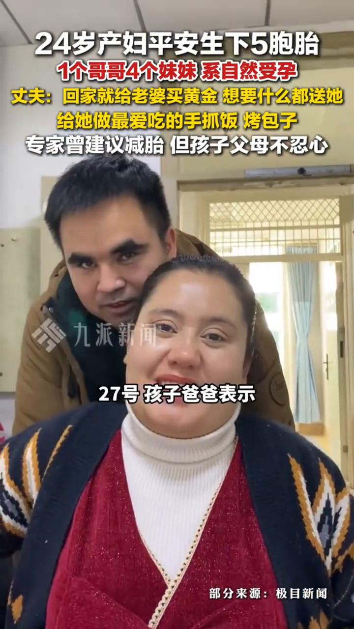 24岁产妇平安生下5胞胎,1个哥哥4个妹妹系自然受孕。丈夫:回家就给老婆买黄金,想要什么都送她,给她做最爱吃的手抓饭、烤包子。专家曾建议减胎,但孩子父母不忍心。 极目新闻。 24岁产妇在武汉平安生下五胞胎,丈夫称回家就给老婆买黄金。2月26号一名新疆产妇在武汉大学中南医院顺利诞下1男4女,目前身体恢复良好。27号孩子爸爸表示五胞胎名字已取好,他心疼妻子辛苦,回家就为她买黄金,想要什么都送给她,(回家后)还会为她做最爱吃的手抓饭、烤包子。 据医生介绍,5名宝宝均为早产儿,最小的女宝仅870克,后续还需闯过呼吸感染、营养等多重关卡。产科专家李家福表示五胞胎极为罕见,曾建议适当减胎,但夫妻俩认为每个生命都珍贵,也担心减胎后影响其他胎儿,最终选择保胎。