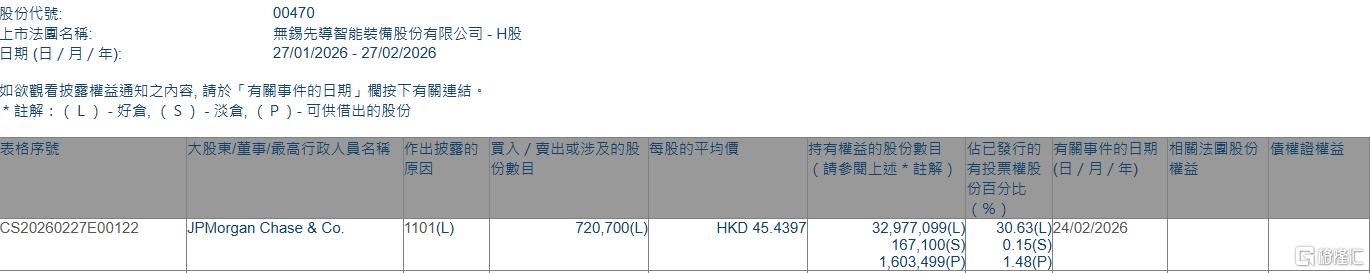 格隆汇2月27日丨根据联交所最新权益披露资料显示,2026年2月24日,先导智能(00470.HK)获JPMorganChase&Co.以每股均价45.4397港元增持好仓72.07万股,涉资约3274.84万港元。