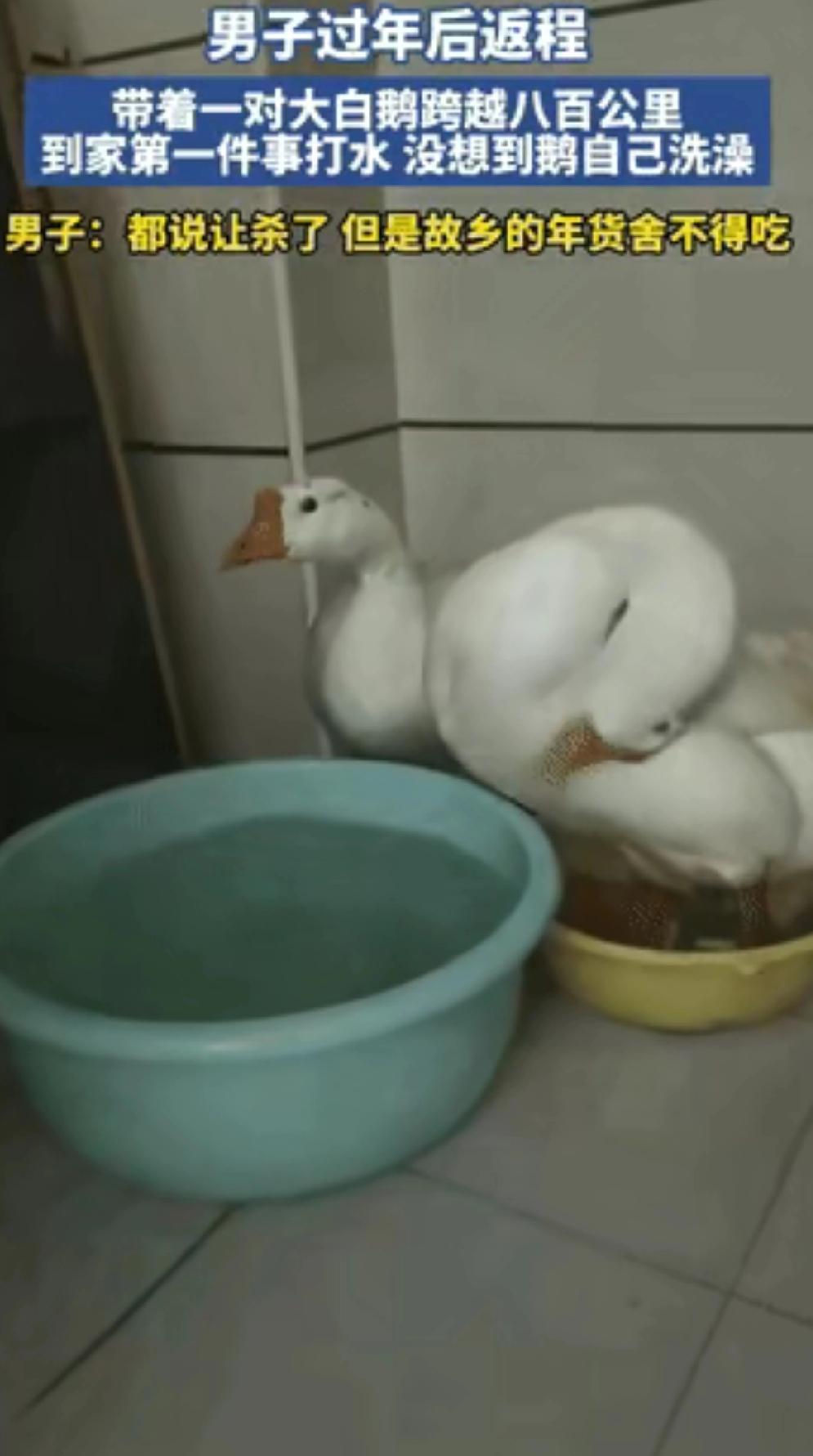 科学都解释不清了! 河南,一男子过年后返程, 带着一对大白鹅开车开了 800多公里,到家后, 男子把两只大鹅拿到卫生间, 没想到大鹅既没有惊慌失措四处逃窜, 也没有大吼大叫,而是第一时间给 自己“洗澡”,网友:别杀了,当宠物养吧。 小赵这一路,车堵得厉害, 开了一天一夜。父母给的大白鹅, 本是过年吃的,舍不得才让他带走。 路上为了鹅透气,还在蛇皮袋掏口子。 鹅这爱干净的举动,把小赵看呆了。网友也说,鹅聪明有灵性,当宠物养挺好。其实啊,动物的这些行为,常给我们惊喜, 它们说不定比我们想象中更有“智慧”。 大家说,小赵该留下这俩大鹅当宠物, 还是炖了吃肉?