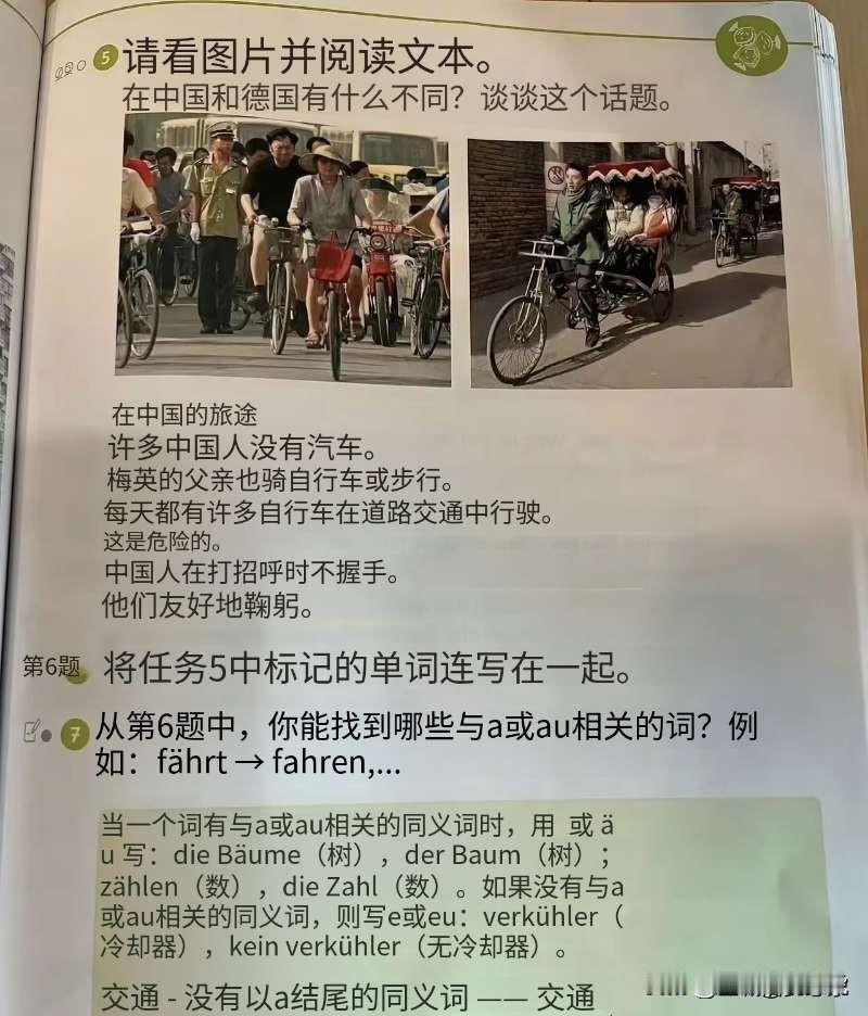 刷到这个新闻真的难以置信!2026年德国教材这样描述中国:满街自行车、见面鞠躬不握手…… 这段描述像一张泛黄的老照片,记得我的童年90年代——这些画面确实是中国的符号,但今天的中国,共享单车扫码即骑,高铁驰骋八方,手机支付早已是日常。 有网友说:“让他们保持对我们这种无害想象,挺好。如果教材写我们高楼林立、人工智能普及,他们反而该焦虑了。” 要我说其实这种认知滞后,恰是中国变化太快的证明。我们在自己土地上过着自己的日子,这种真实生活,比任何教材描述都更有力量。 如果你来编教材,你会选哪个画面代表今天的中国?评论区见! 德国教材里的中国 文化刻板印象 中国速度老外热议中国 外国评论中国