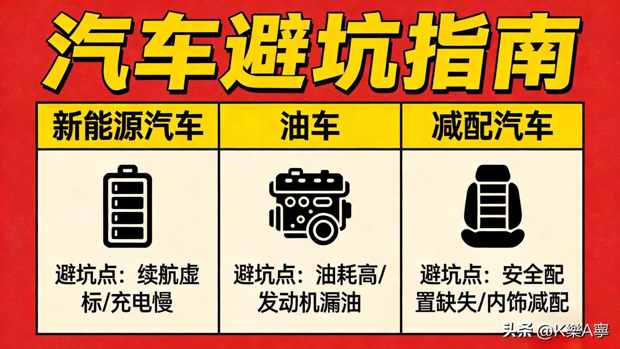 紧急提醒!2026买车别乱选,这3类车白送都别要,老司机都踩过坑 2026车市彻底变天!新能源卷技术、燃油车拼性价比,不少人花20万提车就后悔,今天把买车避坑干货说透,看完少花3万智商税! 第一类:冷门新能源别碰!续航虚标严重,冬季低温直接腰斩,售后网点少得可怜,3年保值率不足3成,换电池比买车还贵,纯纯花钱买罪受。 第二类:大排量油老虎劝退!市区油耗轻松15L+,加95号油烧钱不停,养车成本比车价还高,家用完全不划算。 第三类:减配网红车慎选!只堆冰箱彩电噱头,底盘简配、气囊缩水,智驾过度宣传,安全隐患一大堆,开着心里没底。 2026买车认准这几点:有家用充电桩,选纯电看冬季续航+800V快充;无充电条件,选插混看馈电油耗4L+;家用优先大空间、高安全、真保值。 别再被车企套路了!你最近在看什么车?评论区留车型,我帮你一对一避坑!购车忠告