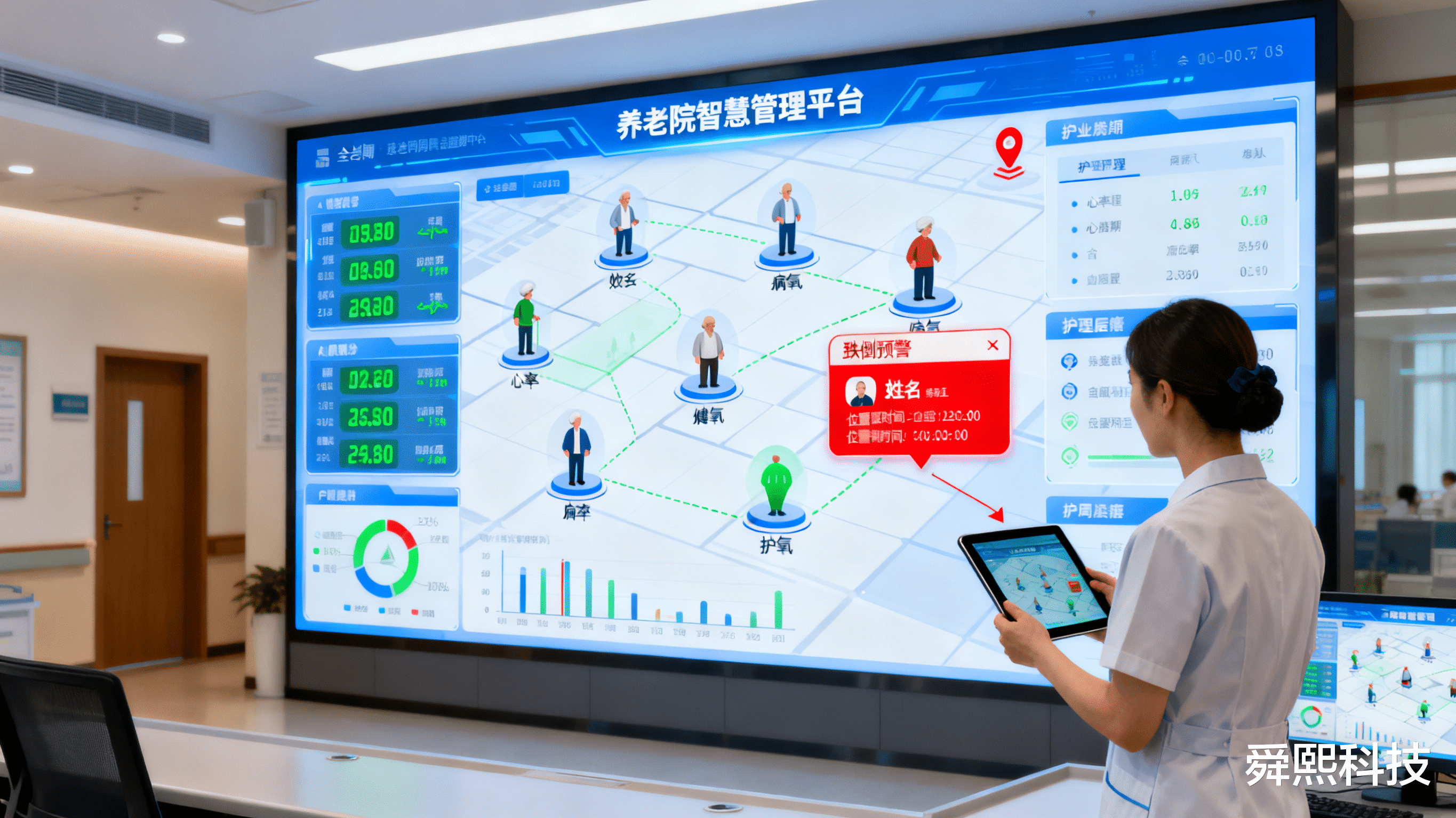 当养老机构的库房仍被堆积如山的纸质档案占据,护理员还在为跨部门信息传递延迟而奔波,老人的跌倒风险只能依赖人工偶然发现——这些行业痛点,曾是制约养老服务质量提升的顽固瓶颈。而舜熙科技研发的养老院智慧管理平台,以“数字化、动态化、实时化”的技术内核,不仅彻底终结了传统养老的“纸质办公依赖症”,更构建起全周期、全场景的智慧养老服务体系,为行业树立了新的服务标准。