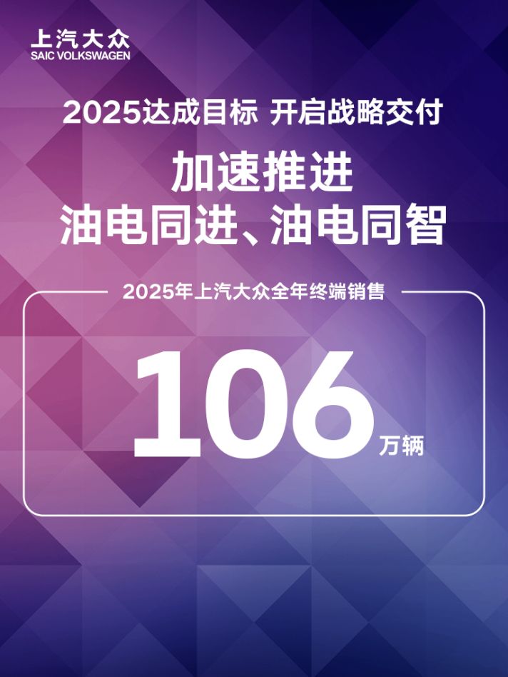 2025年是中国汽车行业从“规模扩张”向“价值创造”转型的关键一年,价格战的退潮让行业重新回归产品与服务的本质,而上汽大众则以全年终端销售106万辆的成绩,成为合资品牌价值竞争的标杆。这一成绩并非依靠短期的价格让利,而是其深耕产品、服务、渠道全价值链的必然结果,更让“油电同进、油电同智”战略落地见效。