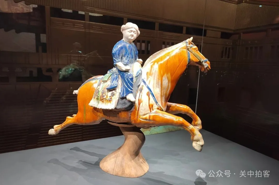 西安博物院藏,出土于西安市莲湖区制药厂唐墓。三彩马四蹄腾空跃起,通体施流动的褐黄色釉,马背骑着一名身穿蓝色长袍的胡人,展现“丝绸之路”文化交融的特征。