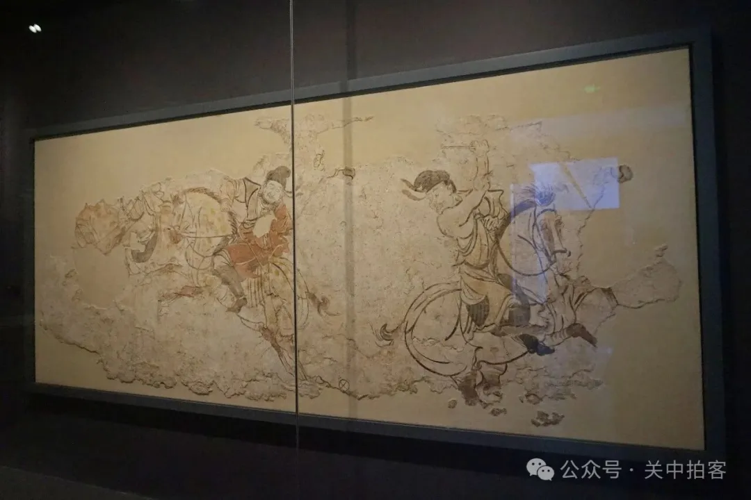 陕西考古博物馆藏,出土于渭南市富平县杜村镇北吕村李邕墓。唐人喜爱马球运动,两人手握球杆,骑在马背之上,双眼紧盯马球。两马腾跃而起,肌肉鼓胀,激烈拼搏。
