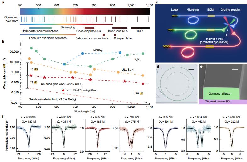 图丨覆盖紫外至近红外波段的超高 Q 值掺锗二氧化硅器件(来源:Nature)
