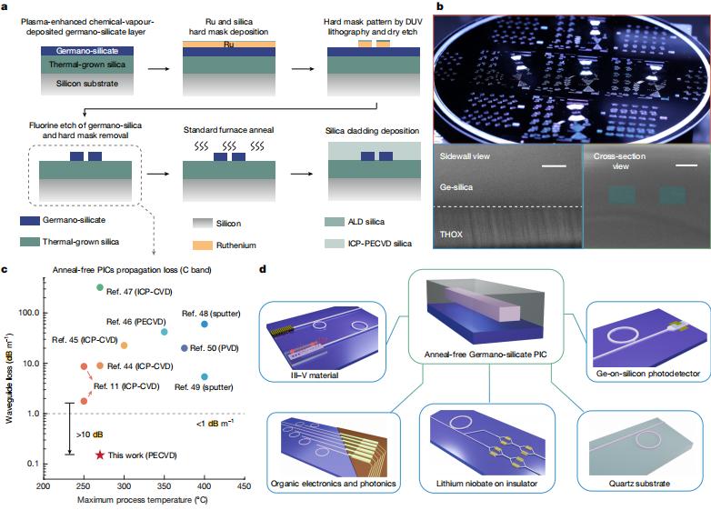 此外,即使在退火前,该光子芯片也能达到1dB/m 的超低损耗,这代表与热敏感材料(包括三五族半导体激光器、薄膜铌酸锂、有机光电材料)具有良好的多材料异质集成兼容性。