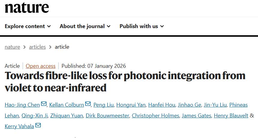 近日,相关论文以《从紫光到近红外波段,通往光纤级损耗的光子集成》(Towards fibre-like loss for photonic integration from violet to near-infrared)为题发表 Nature 上 [1]。