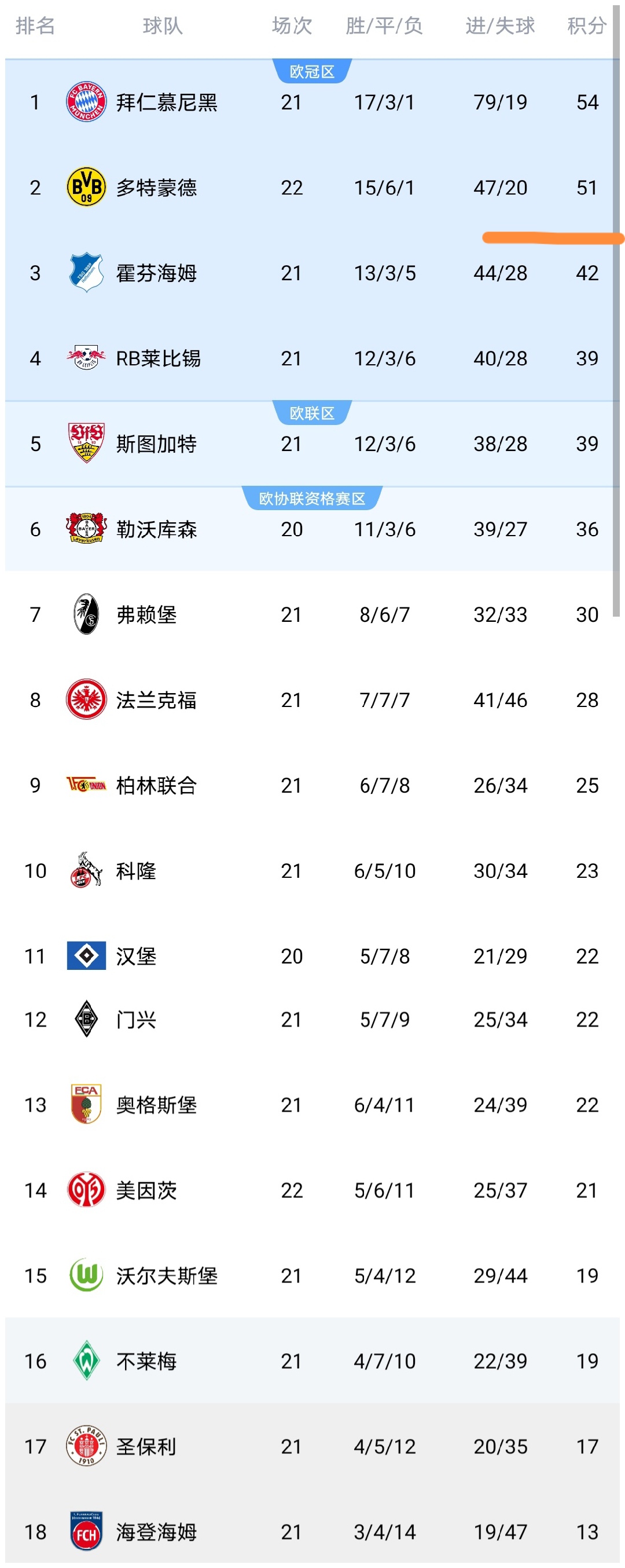 可以看到多特蒙德在4-0大胜美因茨队之后,积分已经上涨到了51分,一夜追到仅差领头羊拜仁慕尼黑队3分,所以拜仁要小心了,拜仁的冠军并不稳了,拜仁领先优势不断缩水,如今缩水到仅领先3分,可以看到多特蒙德队还是很顽强的,没有放弃争冠希望,与此同时拜仁最近的状态起伏不定啊,拜仁必须打起十二分精神,否则真有可能不久之后就被多特蒙德反超了。美因茨输球之后,积21分继续排名第14位,领先降级区2分,美因茨保级压力还是很大的。